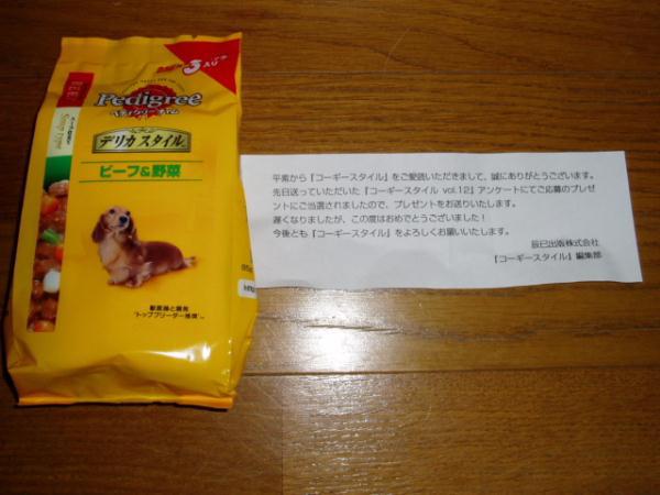 コーギー飼いの愛読誌「コーギースタイル」の懸賞に応募してまたまた当たりました。今回も大した物ではありませんが、ぺディグリーのフード(肉パック)でした。過去2年間に応募した懸賞で結構当たっているんですよ。ほとんどが「コギスタ」で一つは「THEDOG」ですけど。いつも締め切り間際に送り、当選人数の多いものを選んでいるんですけどねでもすごいでしょ!!今回で何と5回目ですよ!モモが来てからというもの、小さな運ですがいい事おきてます。やっぱりコーギーは天使だっ!!