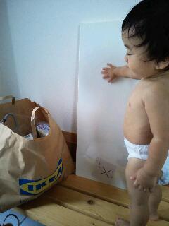 早いもんで、お盆休みも後半。。。子供たちの年齢が上ってくると、「おうちで一日マッタリ」とはいかないもんで、絶対一回はおでかけしないと、収まってくれません疲れがとれませんな(T_T)さて、今回は、IKEAでゲットしたもののご紹介。ん・・・オムツ姿のRiiちんが乱入していますが(^_^;)まずは、マグネットボード(白)です。設置予定場所は、コチラ。キッチン横の壁。moniちゃんのキッチンのとこです。うちには、子供の描いた絵を飾る場所を作ってなかったので、この場所にファブリックボードを作って押しピンとかで飾る・・・?とか、無垢の板張りにして、掲示板みたくする???とか、黒板スプレーを吹いてみる???とか、いろいろと考えてきたんだけど、なかなかピンと来ず。。。IKEAで、真っ白のボードを発見し、パパにコレ!と言った時には、パパは今一つの表情だったけど。強引に買いました(^_^;)1470円だったかな。リーズナブルでしょ設置する!と決まれば、職人のパパは、完ぺきに取り付けてくれます(笑)またもや、築2年半の我が家に、電動ドリルでゴリゴリと穴があいていきます毎回、胃がキリキリしちゃう(^_^;)moniはうるさ~~~い!と耳をふさぎ、Riiちんは、ビックリしてその場から逃げて行きました(笑)で、あっとゆう間に設置完了白い壁に、白いボードなので、違和感なくしっくりきてます。IKEAのディスプレイでは、ファブリックを巻いたりしてたので、真っ白に飽きたらお気に入りの生地を張ったり、いろいろと楽しめそうですいい買い物しました次回は、キッチンのところのお話でも・・・