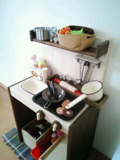 IKEAでは、moniのおままごとアイテムも買い足しました。野菜のソフトトイや、お鍋のセットは持ってたんだけど、今回はおたまやトングのセット(600円くらい)と、お菓子作りのセット(1500円くらい)・アイス・ケーキのソフトトイ(999円)をご所望。。。全部で3000円もするでないかい「どれか一個置いて、二つだけにしなさい(@_@;)」と説得する私。「イヤ!全部いる!」とゆずらないmoni・・・。母娘で押し問答してる姿を、すでに疲れてクタクタになってきたばぁばに見られ・・・「何がいるんな!さっさとしなさい!(^_^;)もうえぇわ、ばぁばが一個買ってあげるわ!」と、moni見事、欲しいものすべてGET・・・。ん~~~・・・、「欲しいものが全て手に入るわけじゃないよ、ダメなときもあるよ」という、私の教育理念からはそれたけど・・・今回は、ま、いっか・・・?(^_^;)よかったね、moniちゃんで、自分のキッチンに、せっせと並べてました(笑)Ulala furnitureさんのままごとキッチンだんだん、かわいく仕上がってきました^m^