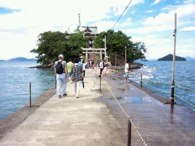 私が住む、香川県には「津島神社」という、子供の守り神様の神社がありまして、それが、なぜなぜ、貴重かといいますと、年に1回しか、開かない、海に浮かぶ神社だからです(^_^)8月の4・5日。年に、この2日しか参拝できません~~~お祭りの日も、平日だったりすることもしばしば・・・そして、こどもの神社なので、独身の時には縁がなく。。。なので、今年、香川県民なのに、生まれて初めて、行くことができました!すごくないですか???(@_@;)ここまで、一本道で橋が渡されていて、(←通行料、大人300円・小学生以上100円)そこを一列に進んで行くの。。。期間が終わると、橋にされてる板が全て外されるらしい・・・パピーから聞いた話なので、どこまで本当かわかりませんが(笑)橋の長さ・・・距離にして、ん~~~、ざっと200メートルくらい?もっと??この日は、満潮と重なって、ものすごい風も強くて、正直、渡るのに必死(^_^;)悠長に写真撮影・・・とはいきませんでした(T_T)橋が全部写せたらよかったんだけども。。。トホホ。夜の方が、参拝者が多くて、橋の上も行列らしいです。橋に灯りがともって、かなり神秘的らしいですよ~~~だから、私達は混雑をさけて、昼間にお邪魔しました(^_^)スイスイ歩けましたよ♪で、この2日間だけ利用できる、JRの「津島の宮駅」!かなりレアですよ~~~写真坊主たちが、バッシャバッシャ撮影してましたよ~~~超コーフンしていました(@_@;)好きな人には、たまらんですよね、なんせ、年一度。。。ちょっと前に、手相芸人さんが、津島さんのことを「こどもには一番スピリチュアルな神社」とTVで紹介してたらしいです。もし、機会があれば、是非行ってみては??(^_^)