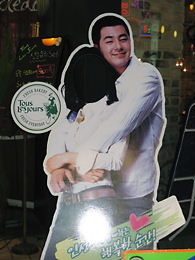 ↑ 「大学路」にあるパン屋さんの前で。昨日の続きで、食事のあと、「大学路」を散策していたらパン屋さんの前にこれが後ろに回って顔をだせば、チョ・インソンとツーショットというよく日本にもあるやつですね~。さすがに後ろから顔を出す勇気はありませんでしたがお友達で彼のファンがいるので、撮ってきました。↑ 同じく大学路にあった「フェイスショップ」の店。これはクォンサンウが広告塔?になっている化粧品のお店ですね。日本にもありますが、韓国で買えば、とても安いのでいいですね。サンウがあまりに色っぽいので撮ってしまいました。↑ 同じく「フェイスショップ」ですが、こちらは翌日(帰国日)に明洞で、です。5万ウォン以上買い物すると、このショップバックとほかにもグッズをくれるらしいんですが・・・さすがにすでに荷物も重かったし、けっこう買ったんですが安いので5万ウォン買うのは大変かもほかにも、安い化粧品のお店はいろいろあって、有名なところもありましたね。やはり安かったのでお土産用にいろいろ買っちゃいました。↑ 明洞の「忠武キンパッ」です。これは「具なし海苔巻き」ですね。ほかのお店のは具があるんですが、この「忠武キンパッ」は具なし、ということで、日本にはないので食べてみたかったんです。スープと辛い味付けの大根とイカのあえものとかが付きます。あえものはおかわりできる?とか・・でもかなり辛くて全部たべられなかったです。味はもちろん美味しかったんですけど、海苔巻き(キンパッ)が小さいのにぎゅっとご飯がつまってて、けっこうボリュームあるんですよ~安くて満腹です食べてる間もひっきりなしにテイクアウトで買いにくるお客さんがいましたね~。この日は明洞のロッテ免税店や、ロッテデパートで買い物して、このキンパッを食べに明洞の街を歩いて、買い物して、あとは東大門にちょこっと行って買い物して、疲れたらスタバで休んで夜のの時間までをすごしました。でも、残念ながらもう写真があまりないので、これで旅日記は終わりにしますね~見てくださってありがとうございました今回は短かったので、本当に韓国の雰囲気を味わうくらいでしたが、とても充実した楽しい旅になりました。まだまだ行きたいところ、食べたいものたーーくさんありますので、次回が楽しみです