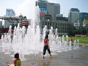 ↑ ソウル市庁前広場の噴水です。噴水の周りになにも柵とかないので、みんなびしょぬれになって噴水浴びてました学校帰りの制服の女子高校生も、制服のまま、びしょぬれでしたよ。どこで着替えるんでしょうかね~でもみんなとても楽しそうでした↑ ソウルプラザホテルのエレベーターの中です。「冬ソナ」で、チェ・ジウが、このエレベーターの鏡の前で泣いてましたね~↑ 「韓定食」です。チャングムみたいでしょここは、やはりみっちー∞さんに教えていただいたお店で、地下鉄4号線の「恵化」駅近くにあるお店です。ここらへんは大学があったことから「大学路」と呼ばれているそうで、とてもにぎやかな所だったんですが、明洞とかとはちょっと雰囲気の違う場所でした。夜にもかかわらず、活気もすごくて歩いていても楽しかったですよ~韓国料理もいろいろありますが、有名なものはともかく、韓国らしいものを食べたくて行ってきました。これは石焼栄養ご飯の付いた、「石焼定食」です。山菜、木の実、海草など自然の材料を使ったおかずが日替わりで24種類ビタミン、ミネラルたっぷりのヘルシーおかずが小鉢に入ってテーブルいっぱいに並ぶんです↑ 手前においてあるのが「石焼栄養ご飯」です。「石焼栄養ご飯」は石鍋にお米(もち米、黒米、米)、栗、なつめ、えのき、ぎんなん、松の実、かぼちゃの種、など15種類の山野菜をのせて炊くそうです。写真は、石鍋から器にうつした後です。移したあとに石鍋のまわりに残るオコゲにお茶をそそいでおじやみたいになったらこれも食べます。↑ お店のご主人が撮ってくれました恥ずかしいですが、せっかく撮ってくれたので載せちゃいます。おかずは日本でもなじみのある食材もあったんですが、味付けも違うし、どれもとても新鮮で美味しかったです。さっぱりしていてヘルシーですし~しかも値段も安くてびっくりです↑ 上はお店の門をくぐったところでご主人が撮ってくれました。下は入り口です。お店を出たあと、大学路を歩いたんですが、屋台も出てたり、焼肉のお店なんかはどこも、満員でしたね~楽しかったです