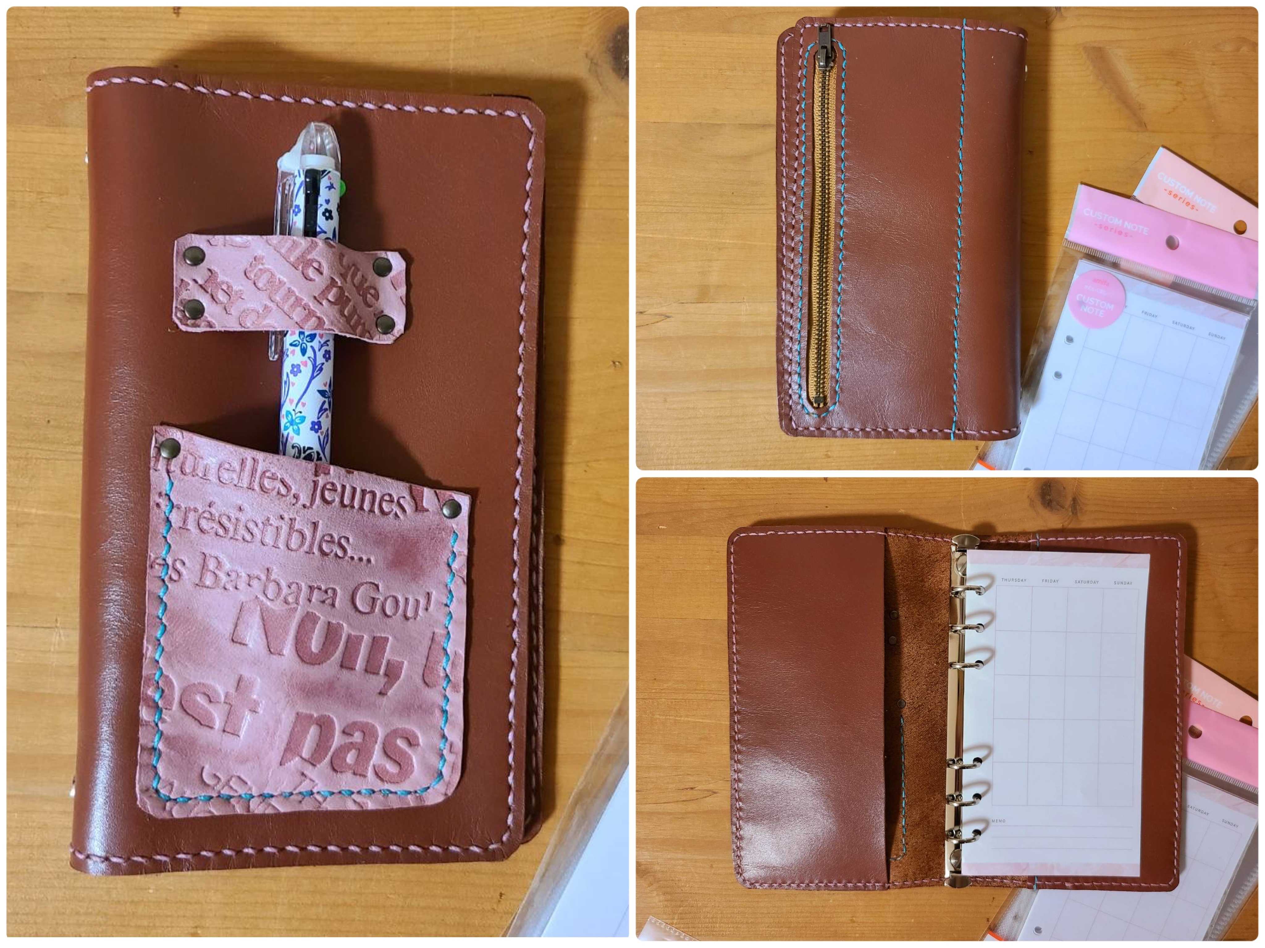 バイブルサイズのシステム手帳を作りました。手帳歴33年。色んな大きさのと形のものを使ってきましたが、最近は子供予定を書き入れる事がなくなったのでこの大きさが今は一番使いやすい大きさになりました。ペンは、この位置が一番使いやすいです。試作品1号で完璧だと思ったら・・。ビニール入れたらはみ出してるではありませんか。サイズ変更して作り直しです。でもね、ビニール使わない人にはこの大きさがコンパクトで近いやすそう。
