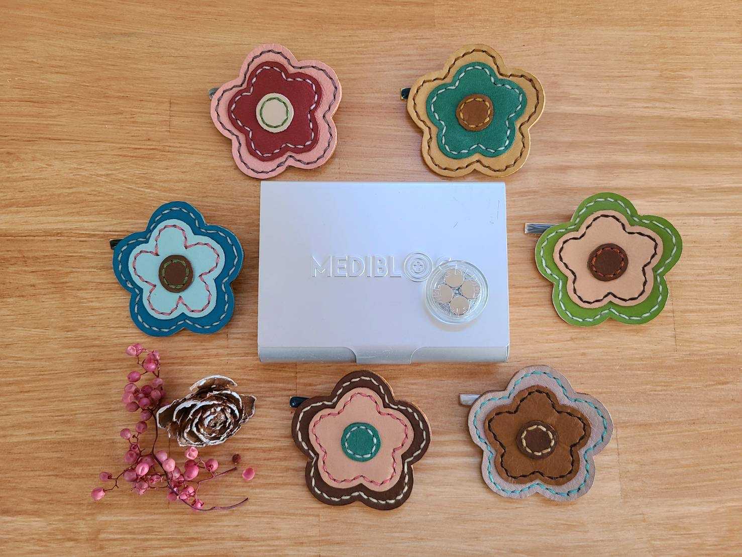 メディブロックケース増産しました。中に磁石を入れて、肩凝りの酷い所の襟元にピンでブローチのように留めるだけ。シール貼ったりはがしたりの手間要らず。
