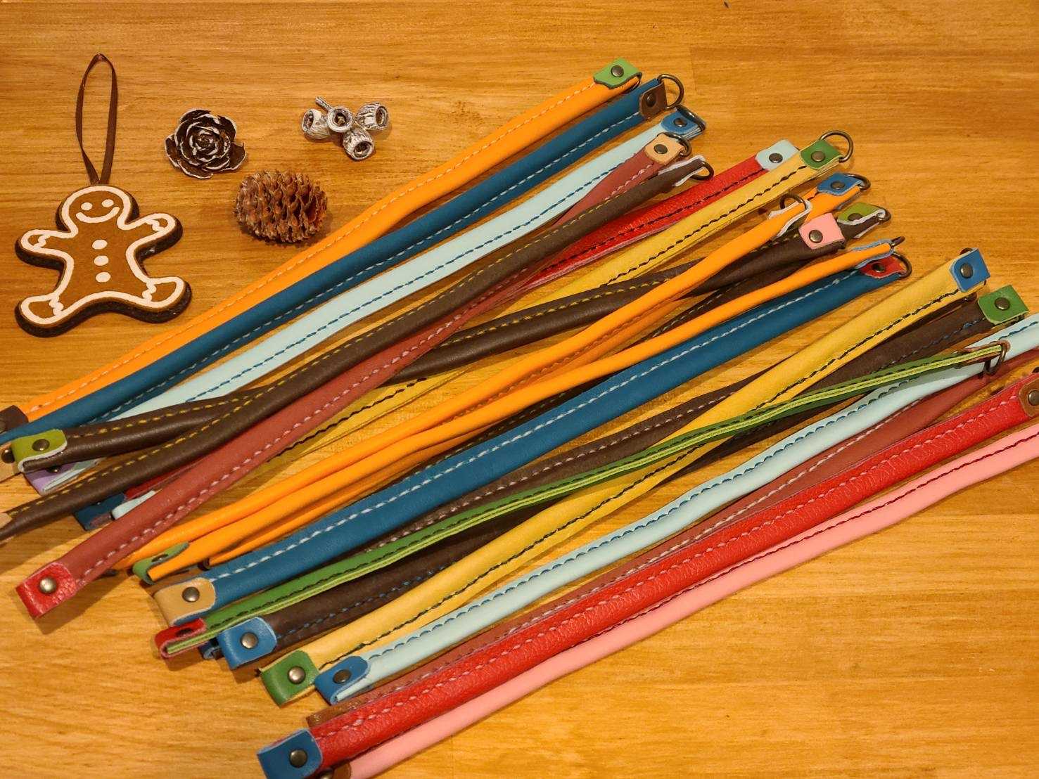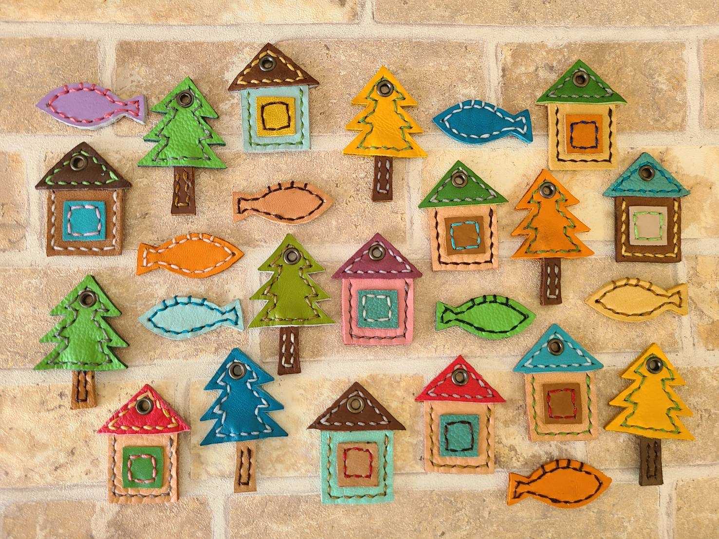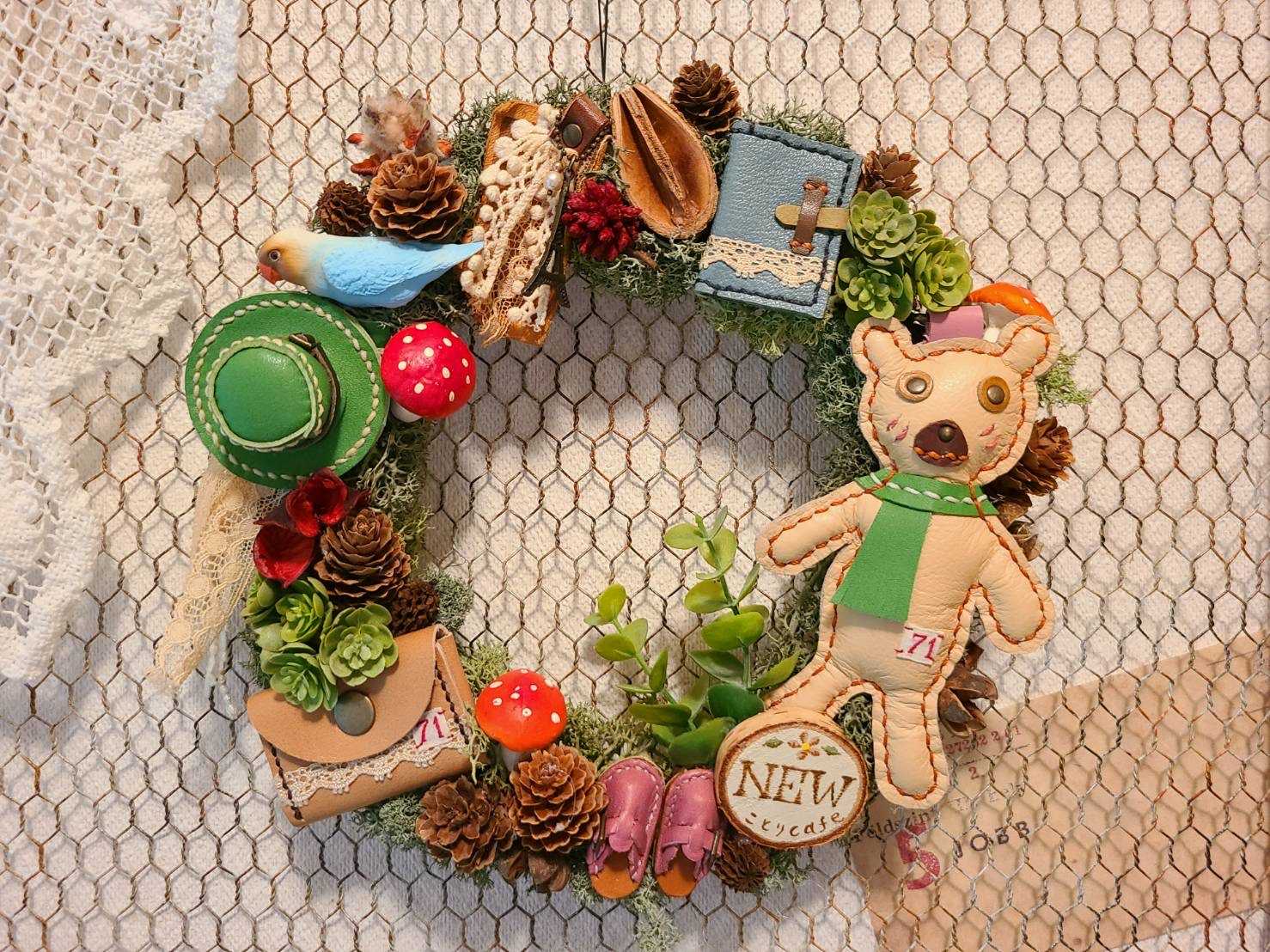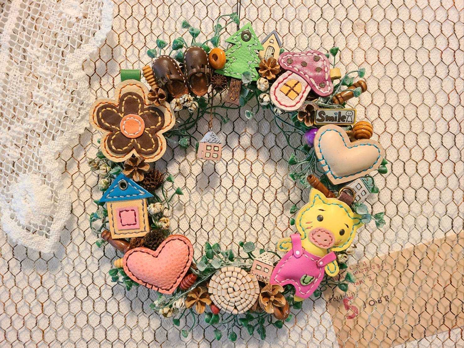 試作品だったり、もう使わない革小物を使ってリースに仕上げてみました。差し色に赤を使ったら、仕上がったリースを見た次女が『クリスマス用?』って聞いてきたけど、これなら一年中飾れるでしょ?。