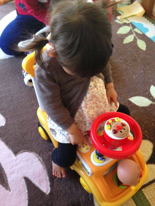 今日はお友達のお家にお邪魔してきました。 アンパンマンカーから一切降りず…こまった(笑) こういうの欲しいねー。 それか、三輪車〜。