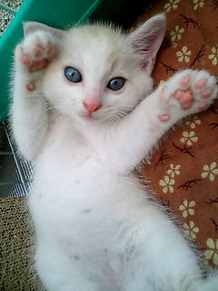 何度もしつこいようですがここは「桃香」の日記です。でもしばらくネコちゃんズ情報が続くと思われます・・・桃香が怒らないことを祈りつつ更新させて頂きます。--------------------ネコちゃんズは日に日に可愛さを増し、その表情からは「警戒」の2文字はすっかり消え去ったようです。 ↑ちょっと体の大きい「1号クン」背中と頭に薄ーーい茶色の模様が入ってます。性格はやんちゃで、とにかく跳ねる跳ねる!イタズラ大好きで人間に懐くのも早かったです。最初に捕獲したのが「1号クン」です。でも実は臆病者で、目薬をさすときには必ず「ニャー」と鳴きます。かなりの弱虫さんです。そして。。。結構おマヌケさんです。トイレの際もネコ砂を一生懸命堀り堀りして穴をあけるのですが、するのは違う場所。そしてトイレから全部砂を外に掻き出して満足!みたいな顔をしているひょうきん者です。お腹を出して「なでてぇ」とねだってくる無防備きわまりないおマヌケさんです。よく遊び食欲も旺盛な愛嬌たっぷりの「1号クン」お目目がキレイなブルーで、とても整った顔立ちをしています。美男子系かも?? ↑続いては体の小さな「2号クン」しっぽに薄い茶のシマシマが入ってますが白猫ちゃんに見えます。ものすごく警戒心が強くいつも隅の方でジーーーっと様子を伺う超慎重派。なかなか心を開かず最初はご飯も食べてくれなかったです。私が捕獲の際に手こずった為、変なトラウマを与えてしまったのかもしれません。でも昨日あたりから突然元気になり、今日はお腹を見せて甘えてくれました。不覚にもちょっと感動(T_T)感動してる場合じゃありませんが・・・・頭はかなり良いと思われます。トイレも完璧です。ネコ砂の中にちゃんとして隠すのも忘れません。そしてかなり芯はしっかりしてると思われます。目薬をさそうが、点鼻薬をしようがグっと目を見開き、うんともスンとも言わないでじっと耐えてます。体は小さいけどこっちがお兄ちゃんかなぁ?って気がします。目はグレーでまん丸。華奢な体だけど気は強そうな子です。 離乳食の時代なのか、カリカリはまだ食べられませんが子猫用の缶詰はよく食べます。 2匹ともとっても仲良しです。よくじゃれあって遊んでいます。その姿はホントに愛らしいです。だからやっぱり2匹一緒に引き取って下さる方、希望です。無理なのかなぁ。。。とも思うんですがでもあの姿を見ちゃうと引き離すのはちょっと。。。とどうしても思ってしまいます。 あまり私がネコちゃんズを可愛い可愛いというと桃香がスネます。と言うかスネました。。。。お線香が。。。。曲がっちゃったんです(;_;)いつものように火をつけて立てたのにふと気づくと火は消え、お線香がお辞儀してるかのようにクタ~って曲がってて超ビックリ!!「桃香がへそ曲げたぁぁぁ!!」・・・・・・湿気のせいなんでしょう。。わかってるけどあまりにタイムリーだったからビックリしたのさ。。。って感じです。ねぇ桃。ネコちゃんズの可愛さと桃香の可愛さは違うんだよ。桃は私の子だもん。ネコちゃんズは猫ちゃんとして可愛いけど桃の事は心から愛しいんだよ。だからスネないでね♪ね、桃♪-----------------ネコちゃんズを愛してくれる里親さんを募集しています。ただ、、この子たちはノラ猫ちゃんです。生体保証などは一切つけられません。病気も今の時点では検便検査などから寄生虫等の異常は見つかっていませんが、今後、なんらかの病気が出てくる可能性はゼロではありません。そういった事も全て飲み込んでそれでもこの子たちを愛して家族になって下さる方がいらっしゃいましたら是非、私書箱にメールを下さい。