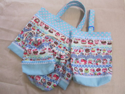 またまたお久しぶりです。チビ、小学校に入学いたしました。・・・と言う訳で入学の為に色々作ったので、お披露目したかったのですが、ブログの写真のアップのやり方がイマイチわからず。。。ちょっとやってスムーズに行かなかったので、挫折しておりました。さぁ今日はどうなるでしょう。。。画像はイマイチですが、何とかアップ出来ましたかなり前に購入してたスイーツ柄の生地を使って、絵本バック、靴袋、巾着袋を作りました。このスイーツ柄の生地は購入したショップさんでは売り切れてるのか取り扱いがないみたいで、他店も探してみましたが、見つけられませんでしたフリルとか裏地などはほぼナカムラさんです。内側はこのラメピンク↓綿ラメプリント生地ピンクx水オーガンジーフリルテープ水色オーガンジーフリルテープ濃ピンクブレード10本セット71008プラDカン(2.5c)10個フリルのテープ、巾着に付ける立体的になってとっても可愛いです。生地が足りなかったので、最後の巾着はこんな感じでした↓お名前テープもナカムラさんだった。27163綿テープ水x白27164綿テープピンクx白次は体操服袋とかご紹介するつもり。。。いつになるかな?