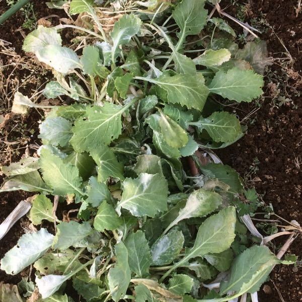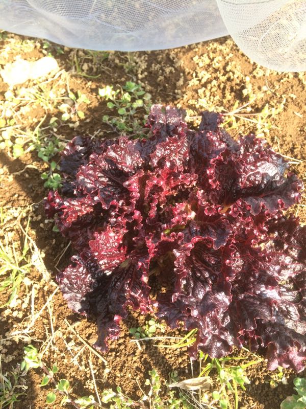 ブロッコリーがあと1つ残っているので、早く収穫しなきゃそう思い、朝畑に行きました。大きくはないけれど、もう収穫出来そう。手にとって、収穫しようとするとなにやら硬いのです。土からブロッコリー全体が動きます。寒さのあまり、土から凍っているようで、収穫できるか?持ってきたハサミが役に立つか?ふと思いました。まだ冷蔵庫にはブロッコリーが残っているので、今回はやめ次回に延期です。そして他の野菜も寒そうでした。前回ネットをかけたサニーレタスはフリルに霜が降りていました。ホウレンソウは霜が降り、寒そうにしていました。これらは日中暖かくなってから収穫に行こうと思います。