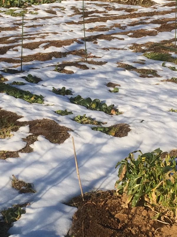 昨日の雪がどうなっているか? ふと畑に立ち寄ることにしました。 予想どおり、真っ白になっていました。 こちらは農家さんの畑。 そして自分の畑はこんな感じです。 真っ白だな〜 誰もまだ踏み入れていない☃️ なにがどこにあるのかわからない状態。 これでしばらくは収穫できないなぁ〜