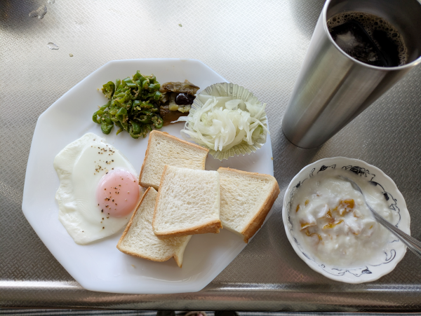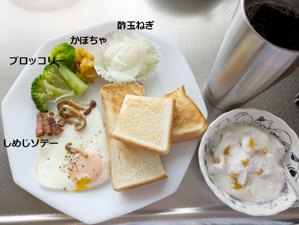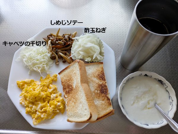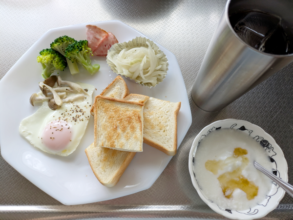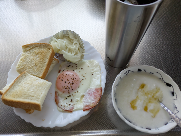 今日も雨の一日となりました。昨日からずっと降ってます。朝ごはん。トースト、スクランブルエッグ、しめじバター、キャベツ、きゅうり酢玉ねぎ、ドライマンゴー入ヨーグルト、アイスコーヒー。90歳の母のお皿はこんな感じ ↓これに、ごはんとお味噌汁(赤だし)となります(*^-^*)お昼ごはん。白菜たっぷりキムチぞうすい、酢玉ねぎ。キムチ系はビール飲みたくなるんだよね。でも今日はとりあえずガマン。。***今朝も雨だったので早朝ウォーキングは中止。昨日から歩いてません。明日も雨の予報なので中止になりそうです。さすがに雨の中、歩く気にはなれない・・・ので足つぼプレートをちょっと多めに使ってます。 自己規制・足はボカシをかけてますw足つぼプレート モダン ロングサイズ(10.5×40.5cm) [色指定不可] ...価格:110円(税込、送料別) (2025/8/11時点)これがなかなかいいんですよ。最初は痛くて片足ずつしか乗れなかったけど今は両足乗れてます。ボツボツが大小3種類あるのでいろいろ試せます。ただ、壁やタンスに手を添えてやらないと転倒の恐れがあるので要注意です。猫ブログも書いてますブログ村のランキングに参加しています 応援☆クリックお願い致します