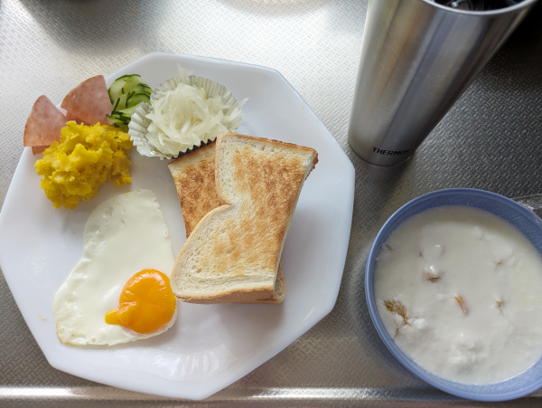 トースト、目玉焼き、カボチャサラダ、ハム、きゅうり