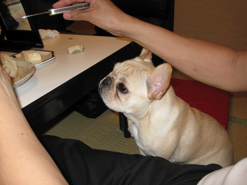 パパちゃんのフランスパンをおねだりしてるのでしゅでも、パパがサクラがジト~と見てるとたべずらい・・・て言うの。失礼しちゃうでちょでもでも、サクラがガンミしてたらパパちゃん根負けしてフランスパンくれたでしゅありがとパパちゃん