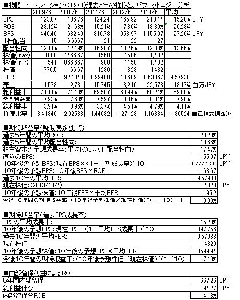 焼肉きんぐ、丸源ラーメンなどを展開するフランチャイズレストランチェーン。急成長中。2013/6月期の決算報告が出ていますので、バフェット分析表を更新しました。(今回、初出)前年比、24%増収、31.7%増益(純利益ベース)売上、利益とも、ハイペースで右肩上がり。ROEは20%程度と高く○。配当は連続増配を継続中。現在株価での、擬似債券利回りは9.99%、EPS成長率利回りは7.13%と、まずまずであるが、やや割高感がある。負債比率は、高かったものが徐々に低下。現在は優良ではないもののまずまずレベルに。高成長中のフランチャイザーであり、注目に値すると思われるがどうか。