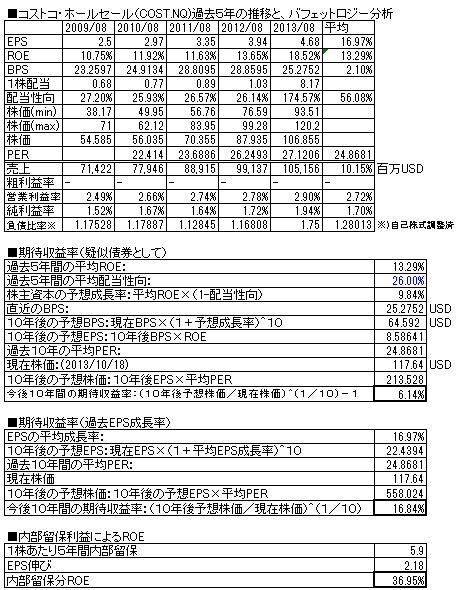 米国の会員制小売・卸売業。そこそこ安くよいものが買えるため、業績伸ばす。日本でも最近店舗が増えてきている。(近所にあり、時々行きます)2013/8月期の決算報告が出ていますので、バフェット分析表を更新しました。(前回掲載分はこちら)前年比、6.1%増収、19.3%増益(純利益ベース)売上・利益とも右肩上がり。ROEは13%程度とそこそこ。配当は、増配継続。(急激に配当が8ドルになっているのは12月に7ドル特別配当したため)前回掲載時点より、株価は21%上昇(96.94→117.64ドル)、現在株価での擬似債券利回り※は、6.14%、EPS成長率利回りは16.84%と、若干割高感がある。(※:特別配当の影響で配当性向の平均値がゆがんでしまうため配当性向は仮に26%と設定して算出)負債比率は、若干高く、財務優良とはいえない。日本で店舗も順次増えてきているし、1ユーザとして利用していて気持ちがよい。業績は思ったより順調に来ており伸びている。株価は割高ではあるが、魅力的な銘柄。劇下げ来ないだろうか。