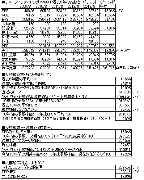 ご存知、ユニクロを展開する衣料SPA。2013/8月期の決算報告が出ていますので、バフェット分析表を更新しました。(前回掲載分はこちら)前年比、23.2%増収、26.1%増益(純利益ベース)相変わらず、高い成長性を維持し、増収増益傾向を持続。ROEは18%程度と高い。配当は連続増配を継続。株価は、前回掲載時点よりちょうど2倍に上昇(18720→37450円)、現在株価における擬似債券利回りは9.89%、EPS成長率利回りは12.22%と、株価上昇分、利回りが下がってきている。負債比率は低く、財務は良好である。新興国への展開が加速してきており、今後も一定の成長をしていきそうな勢いだ。