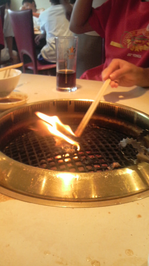 今日は部活の先輩たちと焼肉パーティーに行きました^^なんと1時間食べ放題!!ある一人の先輩が「大食い対決だ!!」とか言い出したので、なんか知らないけど大食い対決が始まりましたww4人1組で食べまくるだけ。大きい皿は完食で10ポイント、小さい皿は完食で5ポイント。ご飯、スープは1杯3ポイントというかんじで、一番多くのポイントを取った組が勝ちということ。自分の組は先輩2人に後輩1人。先輩は両方とも大食いで、後輩は小食^^;自分はどちらかというと大食いですwwそして、戦いは幕を開けた・・・大きい皿のカルビを網に隙間なく置いていき、少し焼いたらすぐ食べるというかんじでした。飲み物も飲み放題だったんですが、先輩命令でコーラなどの炭酸類は無し。ウーロン茶しか飲めませんでした・・・↑燃え上がる肉結果、大食いの先輩のおかげで計165ポイントで見事優勝!!賞品はなにもありませんでした(泣)帰りのバスの中はとてつもなくクサかったです^^;腹いっぱいで、家まで帰るのが大変でしたw今日は晩飯いらないかな?w