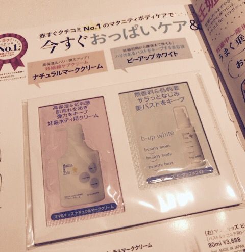 今日8ヶ月の検診でした!すくすく大きくなっているようです。お腹の下のあたりで動く感じがあったので逆子の心配をしていましたがしっかり下向きになっていました。ところで皆さん産婦人科で無料で配られている「赤すぐ」の1月号は手に入れられましたか?実は無料なのに付録で妊娠線ケアクリームとバストケアクリームの試供品が付いてきてるんです!!!無料なのにすごい♪グラム計算をすると約120円分の付録です。妊娠線は妊婦さんの悩みです・・・・無料で試せてラッキーです!さらにこれからベビーグッズの購入を検討されている方にはもってこいの通販1000円オフチケットも付いてきます!出産の情報も載っているので損はないですね。是非手にとってみてくださいね!