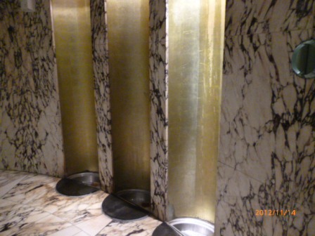 ダイエットとは無縁の日挫折だらけのアル中お気楽ダイエット日記 この日記は11月15日の朝に、昨日の話題を書いたものです。今朝の体 重:ビジネスホテル宿泊中につき不明昨日の飲酒量:缶ビール2個、生ビール2杯、ビンビール大量 大瓶で2~3本ぐらい、日本酒少々2合とっくりで1本ぐらい昨日の歩行数:万歩計を装着していないので不明 体感歩数25,000歩ぐらい商工会の小旅行で東京に来ています。昨日はサービス業部会主催、今日は工業部会(私の部会)の主催で大田区のトンデモナイ町工場を2社見学することになっています。ダイエットとは無縁の日をすごしましたぁ~写真は、昼食をとったアサヒビール本社で黄金のトイレ もう一枚は、黄金のツタンカーメンもちろん本物ではなく、横を歩いて通り過ぎると、目が私を追いかけてくるという、おそろしい展示物です。 ♪♪♪ 私のダイエット目標 ♪♪♪ 2013年10月31日期限 目標68.0kg BMI=21.0を達成します。 2012年11月6日再スタートしました。 再スタート時77.2kg 2007年4月30日ダイエット日記スタート時82.5kg ♪♪♪ 私のダイエット方針 ♪♪♪ 朝と昼は、玄米を中心に少量でもきちんと食べる。夜は極力減らす。 出来るだけ節酒につとめ、お酒は3つ(個、本、杯)までとする。 1万歩以上歩く。失敗してもめげない。いつも笑顔でいる。 ---------------------------------------------------------らぶらぶメールはこちら ke1アットマークpeacom.co.jp よりよいモノ創りで社会に貢献する http://www.peacom.co.jp/
