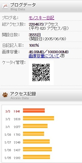 2,639アクセスありがとうございます。挫折だらけのアル中お気楽ダイエット日記 この日記は3月4日の朝、書いています。 今朝の体 重:71.8kg 前日比+0.6kg昨日の飲酒量:缶ビール1個、赤ワイン2杯3月31日までカウントダウンが始まりましたが、体重は減るどころか増えつつあります。さて、楽天ブログを書き始めて、3,555日めの3月2日、アクセス最高記録がでました。2,639アクセス、2ブ 6ロ グ 3サン 9キュウ です。10年近く続けてこられたのは、読んで下さるあなたのおかげです。心より感謝申し上げます。2007年4月30日 ダイエットスタート時82.5kgでした。 2015年3月31日目標68.0kg BMI=21を達成します。 ♪♪♪ 私のダイエット方針 ♪♪♪ 朝と昼は、玄米を中心に少量でもきちんと食べる。夜は極力減らす。 出来るだけ節酒につとめ、お酒は3つ(個、本、杯)までとする。 1万歩以上歩く。失敗してもめげない。いつも笑顔でいる。