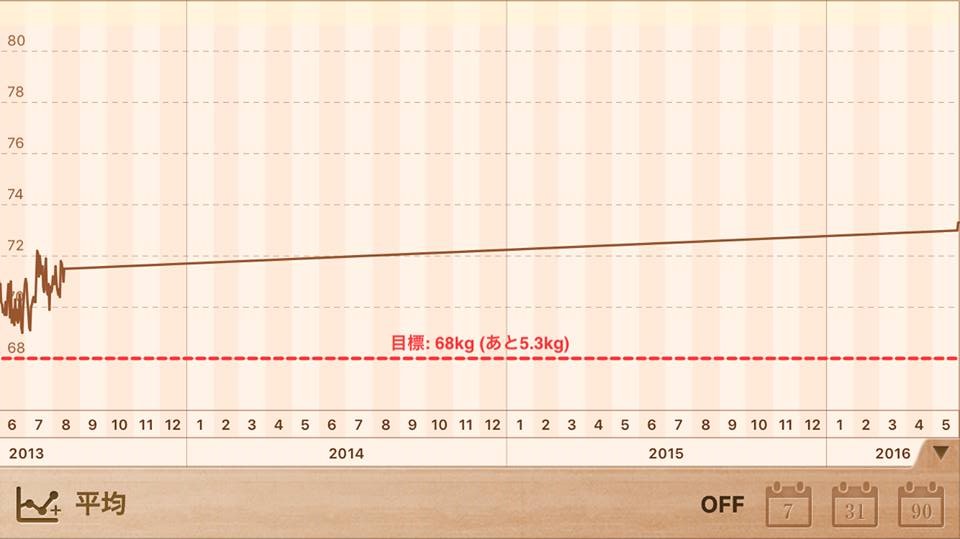 大ショックです。三年分の体重データが消えました。挫折だらけのアル中お気楽ダイエット日記 この日記は5月31日の朝 昨日の日記を書いています。 今朝の体 重:73.3kg 前日比プラスマイナス0.0kg昨日の飲酒量:缶ビール2個、日本酒3杯Simple Dietというスマホのアプリ、娘から教えてもらっていらい2012年6月1日からずっと記録を続けていました。なのに3年分のデータが吹っ飛んでしまいました。ガックリです。立ち直れそうにありません。原因は、3ヶ月以上前のデータに2日分ほど未記入のものがあったため、修正しようとして操作を誤ったのです。2007年4月30日 ダイエットスタート時82.5kgでした。 2016年6月18日目標68.0kg BMI=21を達成します。 ♪♪♪ 私のダイエット方針 ♪♪♪ 朝と昼は、玄米を中心に少量でもきちんと食べる。夜は極力減らす。 節酒につとめ、お酒は3つ(個、本、杯)までとする。 1万歩以上歩く。失敗してもめげない。いつも笑顔でいる。