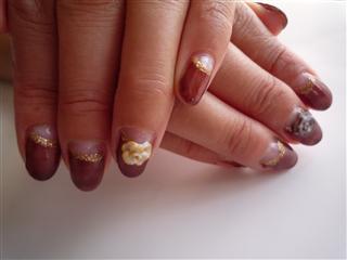 ネイルサロンに行ってきました。今回は、ジェルのお直しでした。ジェルネイルは毎回全部を塗りなおしません。(希望があればやってくれますが)爪が痛むのを最小限にするためらしいのですが、全部剥離するのは2回に1回くらい。前回のアート部分だけ削ってその上に新たにカラーリングしました。 前回のアートが透けたりする可能性もあるので、それをカバーするようなデザインに・・。 秋を意識して、ボルドーで逆フレンチにして、境目にゴールドでラインをひいてあります。そして、左右1本づつ、色を変えてバラの3Dをつけました。 指先はもう秋、な感じですね。 今回はペディキュアもおそろいの逆フレンチにしました。そろそろミュールは履かなくなりますよね・・・。