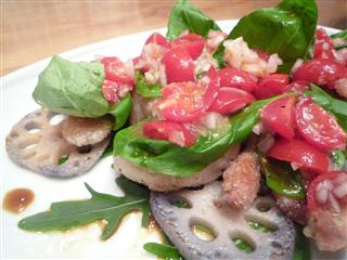 少し前ですが、4月の料理教室に行ってきました。今回は久しぶりの和食 手前は、白身魚の昆布〆桜香り巻き・白身魚のおぼろ昆布包み奥左、三色団子奥右、筍まぶし 筍は煮含めた後にたたいた梅干をまぶし、その上にさらに炒って細かくした鰹節がまぶし付けてあります。このひと手間が美味しさをワンランクアップさせるのですね。 焼き蓮根の葱ソースかけ 普段も作っている焼き蓮根ですが、片栗粉をまぶして焼いたので、少し違った味わい。盛り付けもオシャレ ホワイトアスパラの桜酢がけ ホワイトアスパラは長野県産だそう。太くて立派でした。 切干大根の煮物 切干は聖護院大根との事で、普通目にする切干大根の3倍くらいの大きさ。歯ごたえや甘さもしっかりしています。先生が大量にお取り寄せしてくださったので、分けていただきました。 白玉豆腐 貝柱缶と白玉粉を入れた豆腐を茹でてからお出汁で煮るのですが、食感といい、風味といい、とても美味しかったです。ぜひまた作りたい一品 大豆ご飯 上にかけた、ふきのとうのふりかけが大人のほろ苦さで、大豆ご飯をさらに美味しくしていました。 蓮根の入った葛のジュレ 黒蜜かけ 某有名店の蓮根餅を思い出させる、和のデザート。モチモチの食感と喉ごし。 はるゆたかの黒蜜バー パンのような、お菓子のような、口当たり。程よい甘さで、ぱくぱく食べてしまいました。 今回の和食は、身近な食材をちょっとした一工夫でさらに美味しく、お洒落に作れるというもので、香り高く、春を満喫するメニューでした。