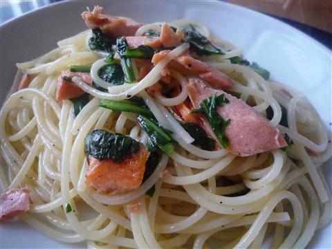 昨日の休みは、久しぶりに家でのんびり。 と言うのも天気予報で全国的に雨。冬の雨では、ゴルフに行く気にはなれない。(寒さに弱い、monzaburo-です。)もう前の日から、引きこもりモード。 朝もゆっくり起き、考えるのはランチの事だけ。 どこかに出かけることも検討したが、anzuにも却下されたためにパスタを作ることに。 最近の愛読書「パスタの絶品」は、カロリーまで表示してある。その中でカロリーの少ないパスタをチョイスして、材料の買出しに行き、作りました。 塩鮭のスパゲッティ近所のスーパーに行ったら、たまたま塩鮭がタイムセールで売っていた。1切れ88円。あさつきの代わりに春菊を使い、かえって香りがよかった。がトラブルがひとつ。 先日ラシックで購入したゆっくり乾燥モチッとパスタが、沸騰したお湯に投入してもなかなかヘナっとならず、結局パスタをお湯に中に沈めるのに2分程度かかってしまった。 そこで茹で時間がわからなくなり、超アルデンテになってしまったのが残念。ただ確かにモチモチして、美味しいパスタであるのには間違いない。次回は、半分に折って茹でたほうが良さそうです。 午後はゆっくり、ワインの整理が出来ました。
