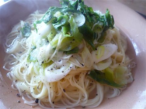 昨日の日中は、結構暖かでしたね。昼過ぎに外を歩いていたら、少し汗ばむくらいでした。早く暖かくなってくれるといいのにな~。 さて、monzaburo-パスタ道ですが、ややサボリ気味でしたね。 しかし、意欲はありますよ! この前も本屋さんで、良さそうな本を買ってきました。今回はその中から、カロリーの少ないパスタ! カッペリーニのねぎスープスパゲッティ コンソメスープのスープスパゲッティ。オイルも使わない、お肉も使わない、使う材料はネギのみ。本では最後にトッピングするのは、あさつきでしたが家になかった。そこで焦げ目がつくまで炒めたねぎを、トッピングしました。もちろんフライパンにはオイルはひきません。 anzu評では、「コンソメスープでねぎをもう少し煮込むと、もっとネギの甘みが出てただろうね。」 はい、気をつけます。 ただ味のバランスもよく、材料が1品のわりには非常に美味しかったです。 レシピは、こちら。