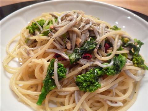 昨日はやっと晴れてきて、陽射しは春でしたが風が強かったですね。 今日はこれからゴルフ、天気は良さそうなので安心。ただ風だけが心配ですね・・・。 久しぶりになってしまったmonzaburo-パスタ道、最近どうも作るより外に食べに行く事に熱心でした。 この日は仕事が終わり、anzuと二人で夕食準備。そこで僕が久々に、パスタ担当になりました。 お題目は、小女子と菜の花。 と言っても僕のできるのは単純な事しか出来ないので、ベーシックなアーリオ・オーリオ系。 アンチョビを使ったのでほとんど塩は使わず、茹で汁のみ。 出来上がった後にanzuに、「白ワイン使った?」 『・・・・・・、使ってない。』 生臭いかなと思ったが、大丈夫。小女子が新鮮なものでしたので、全然okでした。 このパスタとanzu手作りのあんかけオムレツで、まったり飲んだ二人でした。