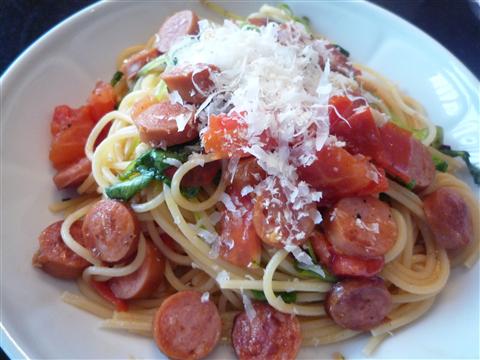決して飽きてしまったわけではありません。 なかなかつくるタイミングを逸し、日があいてしまいました。 日曜日の午前の仕事を終え、ランチをどうしようと思案。ただ仕事場に掃除屋さんが来るので、外には出れない。 では久しぶりに、腕を振るおうかと・・・・。 ただ何せ材料がない。 ありあわせでつくったパスタが ウィンナーとフレッシュトマトのスパゲッティ なんて事はない、普通のスパゲッティーです。でも味はなかなか、意外と美味しく食べる事が出来ました。 とりあえず義務で「美味しかった」と言うanzuの言葉に、気分よくするmonzaburo-でした。