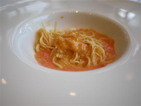 忙しかった木曜日の〆は、梶川です。毎回驚きのある梶川、今回もいろいろ驚かされました。 いちぢくのワインコンポート、生ハム、やわらか胡麻豆腐、とまとの泡トマトのジュレは何度か経験ありましたが、泡は初体験。胡麻豆腐は、ホント柔らかかったです。 J・ラサール・ブラン・ド・ブラン2002 J・ラサール乾杯は、もちろん泡です。 先;トウモロコシの揚げしんじょう、鱧ベビーコーンの下にあるグリーンは、メロン。でもメロンの味はしませんでした。(笑) 椀;マルヴァジア・イストリアーナ2005 ニコリーニトウモロコシの揚げしんじょうの香りと、とても合っていました。 造;本まぐろ、あおりいか、鱸、鱧の落とし隠れて見えませんが、 本まぐろの中トロ、とても美味しかった。 そしてまな板に何か不思議なものが・・・・・。これ、烏賊じゃありません。素麺なんです。素麺を縛って茹で上げたものなんです。 とても細い、三輪そうめん。 しのぎ;白滝そうめん 焼き茄子 蟹 手が込んでます。そして美しいです。食べる時は躊躇わずに、中に落として食べます。 サッサイア ガンベッラーラ non So2 MG2008 ラ・ビアンカーラこの2品には、このサッサイア。マグナムはやっぱりなぜか美味しいです。 焼;鮎、川海老これはふたり分なので、各々のお皿の取り分けます。 これがシロウトが取り分けた図。「なんか綺麗じゃないな~」と言っていたら、梶川さんが鼻で笑いながらお手本を。 ほら、美しいですね。和食の基本は、山高に盛り付けるそうです。 サンセール・グラン・コート2008 フランソワ・コタ少し落ち着いたソーヴィニオンのミネラル感と、この焼きの相性もよかったです。 《後半に続く・・・・・・・・・・・》