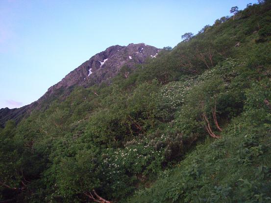 18、19日 と二日続けて白根御池でテン泊となった。。。3日目満点の星が見えた 2:30起床 カップヌードルを食べて準備。予定としては~1000m登って、1700m下る。北岳日帰りや!うずみん☆さん&オーチャンに声を掛ける「じゃぁ行ってきます~」『お気をつけて~~』3:30 ヘッドランプを点けて、暗いうちから出発だ。見上げると、先を行く人たちのヘッデンの灯かりが見える。北岳が見えた!!北岳には、日が当たっている。森林限界を超えた頃、鳳凰三山から日が昇り始めた。三日ぶりの太陽が眩しい~~日の光の中 歩けることが嬉しい! 北岳は。。。期待している程には朝焼けしなかった。。。 柔らかなハクサンイチゲヽ( ^(エ)^)ノイェ~イ~~♪昨日も歩いた縦走路・・・小太郎尾根より甲斐駒・仙丈方面綺麗な富士山 裾野まで見えた奥に見えるのは八ヶ岳( ̄(エ) ̄ )。o0○(…昨日~どこらへんでザックカバー飛んだんかなぁ。。。)こっち側から見ると北岳はゴツゴツの山だ。肩の小屋を過ぎると、一挙に登山者が増えた肩の小屋を振り返る爽快~~もっぺん朝ごはん~~昨夜作ったお弁当を食べました。山頂まで数珠つなぎ・・・6:30 到着~~風が強くて、カッパを着たけれど、寒い・・・手袋を二重にして。。。なんとか^^間ノ・農鳥方面本当は、この先を縦走したかったけれど~今回は下山します。晴れて良かった~~昨日はガスガスで見えなかった中央アルプス・北アルプスの山並みが見えました。お花畑の中を下山♪下界は暑いわ。。。まだ2200mですがw9:00 白根御池 えらい早く降りてきてしまいました。1:30のバスまで時間がありますテントやら濡れた衣類やザックやらを木に干して乾かします。。。干してる間に、今日も御池小屋のカレーを食べました。始めての北岳 三日目に晴れて 本当にラッキーでした。≪おわり≫