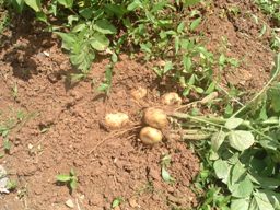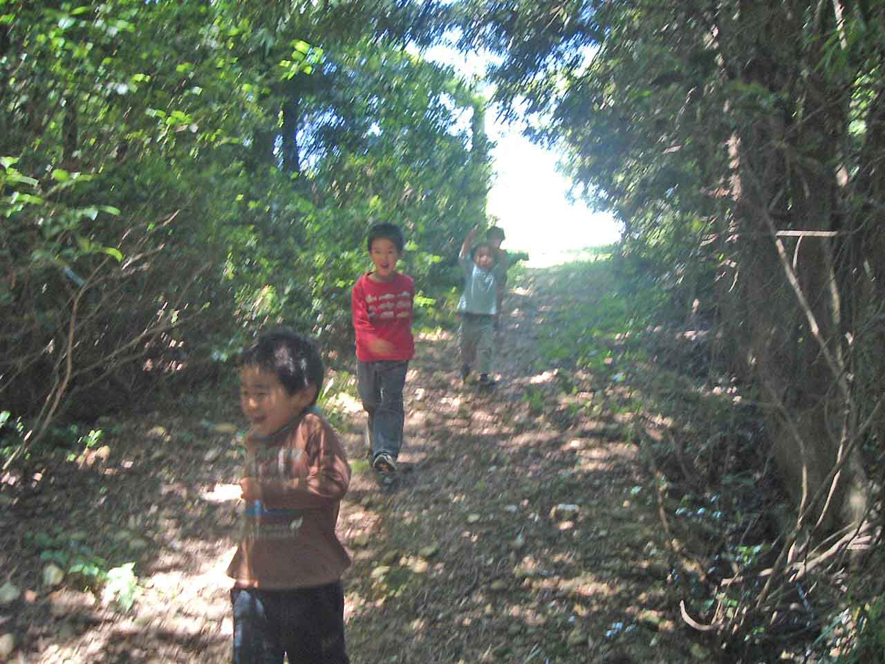 朝、いつもの場所に行くと、NOKちゃんと、YUZくんが、「ちょっと来て!!」っと意味ありげに誘い出してくれました。なんだろう・・・わくわく。ついて行ってみると、みんなから、ちょっと離れた場所で、NOK&YUZ「ここに隠れよう!」森の中、ちょっとした、秘密の場所。秘密の仲間入りをさせてもらえたみたいで、うれしくなりました。・・・でも。いつまでたっても、出て行く気配はなく・・・。NON「みんな、心配してるかもよ~?」NOK&YUZ「いいの!」NON「にじみ絵、始まっちゃうかも?」NOK&YUZ「きょう、やらないもんねぇ~」小心者のNONは、ちょっとドキドキ。しばらくすると、「NONちゃ~ん!!」とみんなが、呼ぶ声が遠くから聞こえてきました。NOK&YUZ「おおきな声を出したら、だめ!!」当たり前か、隠れているんだもんね~。さて、どうするかなぁ~と思っていると、探しに来たお友達に、見つかってしまいました。なんだかどきどきしたけど、朝から、とても楽しい時間をNOKちゃんと、YUZくんと共有できました。それから、畑にみずやり(草がいっぱい!)&ジャガイモを一つ掘ってきました。途中、水やりのペットボトルを坂道で転がすと、どんどん転がっていくことを、GA君が発見!楽しそうに何度も何度も。見ているだけで、子どもたちと居るだけで、幸せだねぇ、とATHUちゃん。私も、ずっと口をあけて笑っていたことに気付きました。これが、幸せなんだなぁ。そのあと、田んぼで、おたまじゃくしや、カエル、タニシの赤ちゃん、トンボを見つけました。GAくん、捕まえようとするけれど、なかなかつかまってくれません。素早い生き物を追う目は、真剣。やっとバッタが捕って、うれしそうでした。 管理している、Tさんが、田んぼはダメだけど、ここの池には、めだかや、おたまじゃくしがいっぱいいるよ~と教えてくれました。そして、びわの木から、実を取っていいよ~と言って下さいました。ありがとうございました。畑について、「年の数だけ、草を抜こうねぇ~」との声に、やる気のない子もちらほら・・・。でも、MAHちゃんの、「ちゃんとやらなきゃだめだよ~」の声に反応してか、少しでも、草を抜きはじめました。私も、みんなを少しづつ引っ張っていかなくては・・と思うけれど、これがなかなか、難しいです。お昼の会。今日のお話は、読み聞かせの「舌きりすずめ」絵がない分、聞いていると、想像力が働きます。みんな最初は、口々にお話していていましたが、途中から黙って、ATHUちゃんのお話に耳を傾けます。朝、「今日はやらな~い」といっていたNOKちゃんですが、しっかりにじみ絵の準備。 YUZくんは、しっかり宣言どおり、やりませんでした。AYUくんも、今日はやらない、とのこと。やらない選択もありなんだなぁ。みんなに、影響されないで、自分の意志で、それぞれの選択をしていく。とても大事なことなのかも・・・と思いました。終わった後は、昨日の続きの泥団子作り。一足先に、おなかが減ったAYUくんは、おべんとう。みんなは、「まだたべな~い!」遊びに夢中。本当によく遊ぶ、遊ぶ。かくれんぼ、大きな枝を見つけて、魚釣り、帽子やタオルを隠して、宝捜しごっこ・・・。人工的なおもちゃが無いから、想像力が、ものすごい。子どもたちの世界は、どんどん広がっていきます。それが楽しくて、素晴らしくて・・・。一緒に入れてもらっているのが、特別な空間にいるようで、すごく嬉しい一日でした。NON