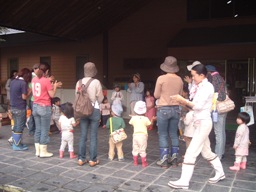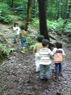 今日も朝から、雨・・・。ぽつぽつと降ってはいたけれど、こないだのきのこ組さん開催の時に比べて、雨も小ぶりで今日はお散歩にいけそう!ということで、きのこ組に参加してくれたお友達と一緒に、お散歩に出発!朝から、ちょっと調子の悪そうなMIWちゃんは、お母さんのお迎えにきてもらった。さみしそうなZEくん。また明日は、元気に会えるといいな・・・。上からのコースと、下からのコースと、二つに分かれて、それぞれ自分の好きなほうを選び、馬のところで、待ち合わせ。GA君&AYU君&KURA君は、早いっ!あっという間に見えなくなってしまった。NONは、きのこ組さんと、SIちゃんNOKちゃんといっしょに、ゆっくり、ゆっくり。石を見つけて、「つるつるの石~!」とうれしそうなSIちゃん。「どれどれ?私の宝物とかえっこ~」とNOKちゃん。ようちえんのみんなにかかれば、森の中のもの、あらゆるものが宝物になってしまう。 石、枝、葉っぱ。素敵だなぁ~。馬のところにつき、GA君AYU君、馬と笹を引っ張り合いながら、あげていた。「馬と綱引き~!!」おいしそうに笹を食べる馬になかなか近づけない、きのこ組のKOHちゃん。お母さんが、笹を上げている姿を、ジーっと見ていたね。お弁当を食べたら、サルスベリまで出発!!途中水溜りを見つけたきのこ組のKOHちゃんHARちゃん。長靴でチャプチャプ、とっても楽しそう!HARちゃんは、朝、新品の長靴が汚れると、「いや~」と言っていたのに、もうそんなことは気にしない。次の水溜りを見つけると、また走っていく。そういう姿を見ると、ついつい私もお母さんの顔にも笑顔が広がる。やっとさるすべりに到着。ずいぶん手前のほうから、「キャッキャキャッキャ!」ってようちえんのお友達の声がしていたけれど、お尻をまっくろにした、楽しそうなおさるさんがたくさんいた。そんな姿を見て、KOHちゃんも仲間入り!みんなが、「ウッキーウッキー!」と叫ぶのを聞いて、TOMOちゃんの手をぎゅっと握りながら、勇敢にも登っていく。ひとしきり遊んだあと、集合場所に戻り、ハーブティをいただいた。とても楽しくて、とてもおいしくて、今日もいい一日だった。きのこ組さんに参加していただいたお友達も、遠くから、ありがとうございました。またお会いできたらうれしいです。 NON