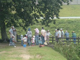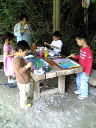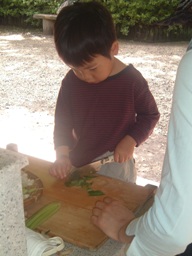 野外料理の日。今まではお家で切った野菜をもってきていたけど、今日から持ち寄った野菜をみんなで切るという作業が増える。火を起こす係り。野菜を切る係り。お米をとぐ係り。それぞれ、みんなやりたいお仕事につく。 YUZ君はママとひとつの炉で火おこし。YUZ君、今日も枯れ木を持参してやるき満々。一方の炉でGA君、AYU君が落ち葉や枯れ木の枝を工夫してセッテイングしている。そこにZE君とMIWちゃんも加わる。昨日の雨で葉も枝も湿っているのかなかなか火がつかない。水場では、NOKちゃんがお米をとぐ。KUR君もお隣でお手伝い。そうこうするうちに、DAは野菜を切る。私、DA母は、いつになく包丁を自分で持ちたがるDAに目が離せなくなり、その後しばらく、他の子達の様子を見ることができないまま時間が過ぎた。 お米をとぎ終わったNOKちゃんとKUR君は、森の中に入っていき、枯れ枝や落ち葉を集めては炉のほうに持ってきてくれた。その後、MIWちゃんママとモグラの穴堀りに夢中に。さて、穴はどこまで続いていたのかな。。。その掘った土が粘土質でいい湿り具合なので、NOKちゃんはその土でおまんじゅうをつくり、おまんじゅうやさんに変身。NOKちゃんの手のひらサイズのしっとりとした赤茶色のおまんじゅうがいくつもかわいく並ぶ。TAKAちゃんにお手伝いしてもらいながら最後まで野菜を切ることができたDAはおまんじゅうやさんのお客さんになる。 ふと炉のところを振り返ると、YUZ君はまだ根気よくがんばっている。すでにGA君、MIWちゃん、ZE君は炉にはいない。AYU君はうまく火がつかないのが悔しいけど、でもやめたくない。半べそかきながらTOMOちゃんに気持ちをぶつけている様子。おなかすいた~の声があちこちから聞こえ始めた。あららと思ったら、AYU君の炉に火がついていた。起こった火の中に、ZE君が角材をたくさん入れて、火はどんどん大きくなった。それに続いて、YUZ君の炉にも火がついた。 その後、TOMOちゃんが「はちみつ」という本を読んでくれた。遠足で行った養蜂場見学の様子がわかりやすく絵と文で表現してある本をTOMOちゃんがゆっくり読む。みんな3日前の養蜂場の風景と思い出を蘇らせながら、いつになくじ~っとTOMOちゃんの声に耳を澄ませ、素敵な絵に見入る。欠席だったZE君も、途中で「ZEもここ行きたい!」と。来年こそは一緒に行けるといいね。本が終わると、梅シロップつくり。みんなで青梅のヘタを楊枝でとって、梅の周りにぷつぷつと穴をあけてガラス瓶にいれる。とくに、ヘタをとる作業は大人気で、すぐに作業終了。その瓶に養蜂場で買ってきた「山のはちみつ」というミネラルたっぷりのはちみつをいれる。とろとろ~っと入っていく様子にこれまたみんなが食い入るように見る。い~におい!梅ジュースがいただけるのは、あとどれくらいなのかな。GA君は、明日?明後日?なんて言ってたね。 そして、待ちに待ったお食事タイム。今日も美味しいご飯とお味噌汁、みんなお腹いっぱい頂きました。TAKAちゃんが、はちみつの容器に残ったはちみつにお水を入れて、かき混ぜて、はちみつジュースを作ってくれました。 みんなそれぞれの役割をこなせて、今日の野外料理が終わりました。今日も、30度近い(?)日だったようですが、森の中は涼しく過ごしやすい陽気でした。私は、炉の火に近づいたとき暖かいと感じたのに、帰りの車に乗ったとたん、暑い~とこのギャップにまた驚きました。(Da母)