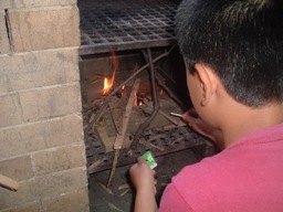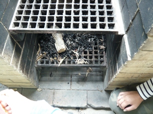 ねっこぼっこのテーマの一つ「火」 今日はどうかな~?マッチマッチ!と朝の会にも来ず、ひとり炉の前で陣取るZe君。朝の会の後、さあ葉っぱを集めに行こう。でも、明け方のザンザンぶりの雨のおかげで、乾いた葉っぱがなかなか見当たらないねぇ。やや乾いている葉っぱを少しだけ集めて、いざ炉に。さあ、俺の出番!張り切ってマッチをするZe君。その横で私もやりたいMiちゃん。二人を見守るG母。もう一つの炉ではAyu君がお母さんと一緒に、なかなかいい感じで火をおこしている。Ze君~、なかなか葉っぱにつかないねえ。何度かやった後、MIちゃんに交代してあげた。Miちゃん、最初は「自分で」やってみたものの力が入らず、G母と一緒にやってみたよ。すると「今日は葉っぱが濡れてるから、新聞使ってもいいよ」とTOMOちゃんのお助け舟。遊んでいたGaも来て丸めた新聞と細い薪を立てて炉の形を作ろうとする。真似してみたいShは、ガンガン薪を入れて、Gaのイメージとは程遠い形になっちゃった。その炉に、今度は自分だけでマッチがすれたMiちゃん。何度も何度も調子よくすってるけど、火は未だ。う~ん、なんで?すると野菜を切り終えたDa君がマッチやりたい~とやってきた。マッチよ!君、人気だなぁ。みんなが交代でマッチをするものの、火は木材につきません。気がついたら誰も炉にいなくなっちゃったよ。一つの炉では調子よくお味噌汁が堂々と煮えている。もうひとつは、、、Ze君がまたやってきた。もう一度、新聞と薪、組んでみようね。調子よく新聞に火がついたら、両手にうちわを持って二刀流のZe君。ハイパワー!今度は一気に火が回って、とうとうTOMOちゃんが飯ごうを載せてくれたよ。火が付いた時にはZe君ただ一人だったけど、総勢何名でこの炉に携わったんだろう。きっとみんなの力で出来たんだね。炉の方が落ち着いたら、小さい子たちと家族ごっこで森に出かけたよ。お母さん役のSiちゃん。お兄さん役でお仕事にも出かけるAyu君、おかあさんが大好きな妹役のMiちゃん。それにお友達のKu君とSh。私はお隣のおばさん役。お母さんを先頭に、お散歩に出かけて、神社についたよ。いつもは、おじさんが笛を吹いたりしてるんだって。社の上を見上げると、梁の先には獅子と、鼻の長いゾウさんみたいな不思議な彫り物があった。きゃ~、おばけ~。みんなで逃げて帰ってきました。戻ったらご飯の準備が出来ていた。今日は具だくさんで豪華なお味噌汁だったね。ごちそうさま。(G母)