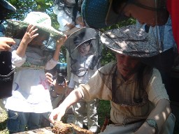 ねっこぼっこでは、一日の終わりに蜜蝋キャンドルを全員で囲んで、帰りの会を行っています。クリスマスシーズンに、自分達で手作りした蜜蝋キャンドルにその日の当番の子どもがマッチで火をともします。一日あったことをみんなで振り返りながら、心落ち着くひと時を過ごします。静かに森の中の音に耳を傾け、ふっと吹き消した後に、漂う甘い蜜の香り。なんとも幸せな空気です。その、蜜蝋が、どんなふうにできるのか、蜂さんのお家を見に、養蜂場へ遠足に出かけてきました。ボランティアカメラマンのKさんにも同行していただいての一日でした。(Kさんの写真にはドラマを感じる!!支援していただくみなさんに心から感謝です。Kさん、いつも有難うございます)巣箱見学では、ひとつの箱に約2万匹いるという蜂さんの様子を見ました。今年は、怖がって近づけない子はいませんでした。みんな、食い入るように目の前まで巣板に近づき、びっしりいる大量の蜂さんたちの様子を眺めます。働き蜂はめんなメス。女王蜂になるかならないかは、ロイヤルゼリーを食べて育ったかどうかの違いとか・・・。みんなよく、働いて蜜をいっぱい集めています。巣板のひとつひとつの巣穴には、輝く蜜が詰まっていて、蜜蝋で覆われているところも。ソヨゴ・アカシア・サクラ.みかん.マロニエ.ソバ・・・色々な種類の蜂蜜があるけれど、花の咲く時期が異なって、その木の近くに巣箱を置いていくと、じきじきに異なる蜜が採集できるとか。それを、放っておくと、幾種類もの蜜が混じってしまうとのことでした。試食コーナーでお気に入りの蜜を見つけて、お買い物。その後で、蜜絞りも体験しました。蜜がぎっしりつまった巣板を、ドラム缶にセットして、ハンドルをくるくる回すと、巣板が回転するしくみで、遠心力で飛ばされた蜜がドラム缶の下にたまって出てきます。出てくる絞りたての蜜は、コクがあって美味しい!!大人気の蜜の味。風にフワっと乗って漂う甘い蜜の香りに、いつかは養蜂をやってみたい・・・と今年も思ってしまうTOMOでした。お弁当の後は、蜜蝋のシートを使ってのキャンドル作り。蜜蝋シートは意外にやわらかくて、作ってみるとおもしろい!!今まで蜜蝋を溶かしてキャンドル作りをしていたけど、これはお手軽で、子ども達にも簡単に作れます。オリジナルデザインの自分のキャンドルは、思い出作りにもぴったりでした。ようちえんでだけでなく、お家でも蜜蝋の甘い香り…感じてみてくださいね。蜂蜜や、蜜蝋のセールが近々あるとのこと、フフフ…楽しみ♪(TOMO)