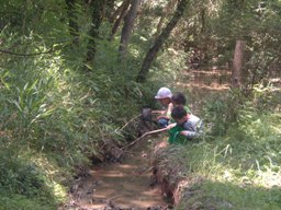 今日は 環境省 中部環境パートナーシップオフィス(EPO中部)から、笑顔が素敵なONさんが取材のため来てくださいました。SIちゃんをはじめみんな 一日よく遊んでもらいました。今 幼稚園では今後の方向性を全員で考え その延長線上にあるものはどういう姿か?明日の定例会では 全員でその熱い思いを語る予定です。とてもタイムリーにONさんが来てくださったこと これも 何かのご縁なのかと感じています。ONさんと語った時間は、とても短いものでしたが 得るものが多く 勉強になりました。ご縁を結んでくださったみなさまに感謝!ONさん 本当に貴重なお時間 お話をありがとうございました。人と人が出逢うこと 森のようちえんを通じて つながっていく縁。いろんなかかわり方があるけれど それを ひとつひとつ 大事にしていきたいと 改めて感じています。 さて、今日は とても暑い一日。でも 子どもたちは 元気いっぱいです。久しぶりに 大きな声で 泣き声の大合唱のDAくん YUちゃん MIちゃん保育当番のお母さんたちは 脳みそとろけそうな状態。懐かしいな~ でも 明日はわが身だわ~~~と思いながら 走って行く子どもたちの後を追っていきました。合流した時には もう 笑顔でいる子どもたち。そして 寛大なお母さんたち。お目当てのザリガニ・・・・どこにいるかな?小川の状況が いつもと違う。水が少ない。濁って よく川の中が見えない。それでも 上手に釣っているNOちゃん(偶然?)上手く釣れなくて 助けを求めるZEくんザリガニのかわりに 自分を釣っちゃうMIちゃん(餌のにぼしをパックン食べてる)網で捕まえているAYくん自力で釣っているGAくんSiちゃん 最後まで根気よく 頑張っていたね~お母さんがいなくても 始終楽しそうだったKuくん 大好きなお弁当だけ食べてたね~ お弁当の後は 水路で 水遊び♪GAくんAYくんKUくんNOちゃんが 大きな波をつくっていたね。大きい子から叱られないように 要領よく 出たり入ったりしていたMIちゃん。見てて おもしろかったよ~それから 暑い川のなかでどくろを巻いていたヤマカガシを発見したね~畑の道の田んぼとは違う田んぼの中 違う生き物がいて いつまでも見ていてもあきない。気がつくと 帰りの時間!!大急ぎで 帰路へ向かう。今日も 楽しくていい一日だった~ あ~~幸せ♪今日も 一日 ありがとうございました。