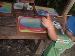 いつもは留守番のYUZ母ですが、今日は畑に水まきについて行きました。行く途中に子ども達が必ず足を止める場所があります。そこには、水があったり、溝飛びしたり、かえる、とりなどの生き物がいるとっても魅力的な場所。水の引いてある田んぼには、かえるとおたまじゃくしがいっぱい。飽くことなく見ていた子ども達ですが、ご近所の方に注意を受けました。『子どもは何をするか分からない。転んで稲を傷めたり、石を投げたり・・・親がよく見とらないかん。田んぼに子どもが近づくだけでいやがる持ち主もいるから、気をつけなさい。』というような内容でした。子どもの行動、遊んだ後の片付けや、ゴミなど、気をつけて活動しているつもりでも、注意を受けることがある。地域の方のご迷惑になるような活動をするのは、本意ではないし、するつもりもないけれど、子ども達にさせてあげたいと思っている事が、しにくくなっていく・・・ATUちゃんが「いろいろ制限がかかってきて、きびしいね」、ぽつりと言った。にじみ絵の前に読んでもらった本は、『もりのなか』です。白黒の挿絵で、男の子が森の中で色々な動物に出会いながら、一緒におさんぽしていくお話です。『またもりへ』 という続編があります。今日は赤がピンク色に見えるほど、薄めだったのですが、とてもいい感じ。毎回一緒のいろではなく、一色の中で、色々な濃度があって、それを感じてもらうのもいいな~と思いました。その後は、片付け(水遊び)チームNO&YU と、お弁当チームGA&AY になりました。 全員のお弁当が終わった後は4人で、いろいろ遊んでいましたよ。走り回ったり、隠れたり・・・NOちゃんが乗ったベビーカーを、順番で押したがる3人が、おかしいやらかわいいやら。帰りの会は、ATUちゃんがマッチを忘れてきたのですが・・・今日の当番のGAくん、それじゃあ火がつけれないので、「じゃあもう、帰りの会やらない。」と、すねて柱の陰へ。ふふ・・・GAくん、自分が出せるようになってきたのかな。今日は、ベテランうぐいすの長鳴きを聞きました。終わった後は、拍手!!の気分です。オオルリらしき声も・・・ねっこぼっこに通うようになって、今まで興味のなかった鳥の声や自然の音に耳を澄ましたりする自分を発見。オオルリ、うぐいす、キビタキ・・・姿も見てみたい。(YUZ母)