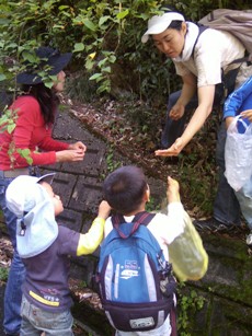 蒸し暑い中、雨が降るか降らないか・・・の心配をしながら、今日参加していただいた、きのこ組さんの親子と一緒に、お散歩に出発!!ここをお手伝いさせて頂いて、もう3ヶ月が経つのに、まだまだ、行った事のない道がたくさんあります。今日の道もそのひとつ。どんな道が待っているのか、わくわくしながら、進んでいきました。最初から、「リュック、背負うのはいや~」のZE君のリュックを軽々と、AYU君が持ってあげていました。第一回目の休憩所。天文台のところで、葉っぱでじゃんけんをしたり、虫を捕まえたり、タイルでできた椅子によじ登っては、飛び降りて遊んでいたりしました。体験にきた子も、お母さんの手を握って、ジャンプ!!「今、子どもの手が震えていたわ~」なんてお母さんも、子ども達のそんな勇気にびっくりしていました。さあ、もう少し歩こう!今度は、ちょっと険しい道。でも、お構いなし走っていく子ども達。たくましいなぁ。今日参加してくれた、KA君は、NONを抜かし、ぱっと振り返ってNONの手をとり、走っていきます。「うれしいなぁ~」なんて思っていると、すぐお母さんに、「だっこ~」・・・この間がとてもかわいかったです。手を引っ張っていってくれてありがとう。YU君の、お母さんは、妹のHIちゃんと歩いています。「あれ?おにいちゃんは?」と聞くと、お母さんは、「もうずっと先に行ってます~。」とのこと。幼稚園の子たちと先頭きって、走って目的地まで行っていたみたいです。 先頭のほうと、ずいぶん距離ができてしまい、目的地に行く道が二つに分かれていました。森の中と、砂利道。お母さん達と相談。でも、迷わず森のほうへ!森の中は、ひんやりとしていてすずし~い。こっちを選んでよかったね。さあ、東屋に到着!!後方の私達を出迎えてくれたのは、MAHちゃんの、葉っぱおばけ。続いて、AYU君YUZ君も・・・。MWちゃんも、YUNちゃんも、「こわい~!!」と泣き出してしまうけど、「子どもは、食べないよ、大人だけだよ」とやさしい言葉をかけてあげていました。大人だけ?ということは、ここにいる大人はNON一人。「キャ~逃げろ~!!」なんていっているうちに、さっきまで怖いって言っていたMIWちゃんも、MAHちゃんから葉っぱおばけの仮面をもらって、葉っぱおばけの仲間入りをしていました。いつもなら、ここでお弁当・・・というところだけど、今日は、ここでお茶休憩!もう少し歩こう!少し広場を抜けて森の中へ入っていくと開けた場所がありました。今日はここでお弁当&説明会。みんな、がんばって歩いたねぇ~。・・・でも、そこへ行く前に、大きな砂山が。見つけたMAHちゃんKURくんSHUくん。今日参加のYU君まで、「お弁当、いらな~い!」と遊んでいます。こんなにも夢中で遊べるものがあるなんて、すごいっ。お弁当を食べ終わった子もどんどん来て一緒に遊びに加わっていきます。みんなで、ぶつかりあったり、仲良くなったり。見ていて、とっても楽しかったです。ねっこぼっこの特徴のひとつとして、すごく仲間意識が強いこともあります。前まで、新人だった、年長のGAくんが、いつのまにか、みんなの頼れるお兄ちゃんになっていたことも、嬉しい発見でした。新しい子たちと交じわいながら、輪が広がっていく・・・・そんな印象を持った一日でした。雨も持ちこたえてくれて、皆さんととても楽しいひと時を過ごすことができました。遠くから来てくださった方、朝早くから来てくださった方、ありがとうございました。またお目にかかれることを楽しみにしています。今日は、お疲れ様でした。NON