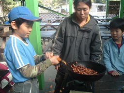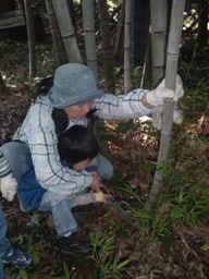 12月8日に年に一度のねっこぼっこ最大のイベント『森であそぼう ねっこぼっこ祭り』が開催される。森で過ごす楽しさや、木工細工・羊毛遊び・キャンドル作り・野外料理を親子で体験してもらう。今年は春日井市から後援を受けての開催となり、現在準備におおわらわ。さて、祭りの最後に全員で楽しむバンブーダンスと、森の中の平均台に使用する竹の切り出しを行なった。いつもお世話になっているTOMさんの竹林で 大人も子どももノコギリを握り締めて 頑張る。水平にノコギリを引くのが子どもには難しく、苦戦するものの意外とみんな根気良く取り組んでいる。竹切り名人NORさんの指導のもと、次々に切っていく。 竹林の周りにはルビー色に輝く冬の定番の味覚・冬イチゴがいっぱいあって、子ども達のおやつとなり、息抜きにもちょうどいい。こうして太い竹1本、細い竹8本を切り揃え、弁当の場所にみんなでヨイショ ヨイショと運んだ。頑張った~!!さて、弁当の後は お待ちかねのドングリ餅作り。今年もお母さん方が一生懸命皮をむいてくれたドングリ。ミキサーにかけて、絞り、ドングリの中の澱粉質を取り出し、何度も水にさらしてアクを抜き、やっと集めたドングリ粉。1ヶ月ほどかけての前準備。今年は昨年よりもたくさん採れて、みんなにもしっかり食べてもらえそう。ドングリ粉と砂糖、水をよく混ぜ合わせ、火にかける。段々透明度が出てきて、サラサラだったのが粘り気が出てくる。色はこげ茶色で ドングリらしい。子ども達、気持ち悪~い、まずそう!!だって。焦がさないように、交代して練り続けること数分。バットに取り出し、水で冷やし固め、切り分けた。黄な粉や蜜をかけて 食べると、ワラビ餅のような美味しさ。子ども達もおかわりして食べた。お母さん方にも食べてもらった。去年は量が足りなくて、薄かったのであまりしっかり固まらなかったけれど、今年のはプリンプリンとした歯応えのある出来だったね。あく抜きをしなくても食べられるマテバシイも炒って食べた。(ちなみに ドングリ餅にはほとんどアベマキを使用。あく抜きしなければ渋くて食べられたものでない)こちらも 子ども達の人気メニューになった。年に一度しか食べられないドングリ餅。どうってことのない、素朴な味わいだけど、時間と手間をかけて食するこの秋の味覚を 大人になっても きっと覚えていてくれると願う。秋の森の臭い、風景と共に・・・。 TOMO