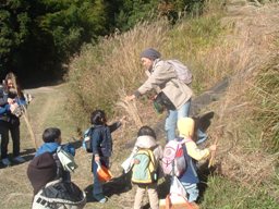 今朝は朝からいい天気!朝の会で、行きたい場所を聞くと“さるすべり”と“おばけタニシ”の2箇所があがる。手をあげてもらうと、おばけタニシの棲む池に行きたい子が多数。さるすべりに行きたかったAYU君&RYO君コンビは、すぐに気持ちを切り替え出発。一昨日、朝お母さんと別れる時、とっても悲しくておさんぽにもなかなか気が乗らなかったZE君。今朝はMIちゃんママと一緒に登園。今日は明るい顔で先頭を切っておさんぽ出発。どんどん先に行きたくてたまらな~い!そのうち、AYU君とSIちゃん、MIちゃんとKUが、横一列に手を繋ぎ、早足で追い越していく。AYU君とSIちゃんがリードをとって進んでいるみたい。二人の話し声が聞こえる。MIちゃんとSIちゃん、リュックを交換してしょっている。二人に話しかけると、SIちゃんが「私はMIちゃんで、MIちゃんは私なんだ」と言う。そうか、リュック交換は、お互いに相手になるごっこ遊びの内容のひとつだったんだね。おばけタニシの池につくと、木陰でひんやり寒い。杭に渡してあるロープに、子どもはぶら下がったり、乗ってバランスを取ったり。大人の私は、ねっこぼっこ祭りで行う、《暗夜行路》をこっそり練習。暗夜行路とは??森のなかの枝と枝の間などにロープを張る。そこを目隠しした状態で、手に握るロープの感触を頼りにつたい歩きするフィールドゲームの一種。MIちゃんママが、昔したことがあって、面白そう!というので今回のお祭りの目玉の一つとして採用された。今夏のねっこぼっこキャンプの時にも、短い距離ながら大人も子どももチャレンジした。ぐらぐらしたロープに掴まって、目が見えない状態でおっかなびっくり前に進むのって私はわりと勇気が必要でした。また、目を隠されることによって、感覚が研ぎ澄まされる感じがあり、面白い~。お祭りに来てくださる方、ぜひ《暗夜行路》お試し下さい。さて、AYU君珍しく、池に着いてしばらくしたら、お腹空いた~と言う。まだ10時半だったけど、他の子も食べたがったし、今日は偶然早めに戻る用事もあったので皆でお弁当を広げる。以前、同じ位早めに子ども達の求めに応じて、お弁当を広げたことがあった。その時は、気持ちは食べたくとも、お腹はまだ空いてなかったのか、少し食べて後は残してしまう子が多かった。さて、今日は??あれれ、大抵みんな綺麗に食べてる~。今日はお腹の虫がホントに鳴いていたみたい。それから、RYO君・YUT君・AYU君・KUが、何やらちょっと離れた小川のほとりでしゃがんで何かしている。聞いてみると、小枝で葉っぱを釣りあげていたんだって。その後も男同士、無言でかたまって長い間釣りをしてたよ。その後、定番の馬の場所まで戻る。そこまでの道のりは、ポカポカしてとってもいい気持ち。はしゃいで走っていく子が沢山だったね。森から出た瞬間、空が高くて見惚れてしまう。ヤッホー、とか、オーイ!と叫ぶと、遠いところまで声が届きそう。きんきんきれいな“秋の空”の、歌のとおりの光景です。私はSIちゃんと、最後尾からのんびりいろいろ採集しながらついていく。SIちゃんは、毛虫みたいなおっきなネコじゃらしみたいなのや、キノコや、ヤマイモの種なんかを沢山持ちながらも、また目新しいものがあると止まって見ている。後ろからのんびりついていくおさんぽも、心地のよいものだね~。その後、みんなでお馬さんのところでまったり過ごしました。今日一緒に行ってくれた、ちっちゃなTAK君、今日も沢山冒険をしていました。川に入ったり、馬を間近で見たり。彼の冒険心は凄い!!また一緒に行こうね。(TAKA)