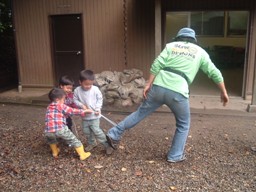 この日は野外料理でした。雨が朝からパラパラだったけど、火おこししたり、遊んでいるうちに止んできちゃった。最近続いている染物。今日は、羊毛をマリーゴールドで染める。初夏に園児が種まきし、家に持ち帰り育ててくれていた花を収穫して使用した。お湯に花びらを入れると、プン、と花のいい匂いが・・・・・GA君、今日はYUT君に火おこしを教えているうちに、自分も熱中。上手に火を育てて、GA君の自信に繋がったかな?スタッフが持参したスダジイも炒って食べました。ほんのり甘くて美味しい!染物の先生と化しているTOMOちゃん。今日も終了後は手がマリーゴールドの色でまっ黄っ黄!お昼を食べ終わると、いつのまにか遊びが開始。どこからか拾ってきた紐で、子ども達電車ごっこ開始→綱引き→TOMOちゃん発見!つかまえろ~→TOMOちゃん確保! さて、帰りの会も終わり、親御さんがチラホラお迎えに来る中、遊んでいると、おや、見たことの無い車が停まる。降りてきたのは、なんと園長あっちゃん!!あっちゃんと娘NOKちゃん登場に大人も子ども達も大喜び、NOKちゃんは照れてなかなか車から降りて来なかったね。一旦降りると、会わなかった分を取り戻すように、皆NOKちゃんと遊びたくて、追い掛け回していたね。NOKちゃんも恥ずかしそうながらも、ニコニコでした。あっちゃんは現在産休中。赤ちゃんのYUNちゃん、とても可愛い♪余裕のあるときがあったら、またふらっと立ち寄ってね!あっちゃんの顔を見るだけで、みんなパワーが沸いてきます。(TAKA)