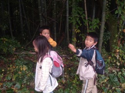 空気の澄んだ秋晴れの今日。朝の会を終えて、TOMOちゃんの誘いで、みんなでおばけたにしに向かう。Gaくん、Ayuくん、Ryoくん、Kurくん、Yutくん、Syuくん、Zeくんの先頭集団はTOMOちゃんとともにあっというまに見えなくなってしまった。私と、TAKAちゃんと一緒にのんびり歩き始めたのは、Miwちゃん、Da、Yun。おばけたにしの手前でZeくんが濡れたズボンを履き替えているところに追いついた。濡れた靴を履くのはイヤだ~と言いながら、道の真ん中だったけど、突然お弁当を開けて、「ちょっとだけだからね」といいながら食べ始めた。本当に半分も食べないうちに、Zeくん、お腹が満足したと同時に、気持ちもすっきりしたのか、さっさとしまってリュックを背負って歩き始めた。Zeくんのおいしそうなおかずを覗き込んでお弁当が食べたくなったのか、自分のお弁当箱を開け始めたMiwちゃん、Kurくんも慌てて、しまい込んで出発。 おばけたにしの手前に森の中に続く木の階段を見つけた先頭集団の子達がその前で待っていた。こっちに探検に行ってみようとのこと。どんどん階段を登っていく先頭集団の子達は、ゆっくりいく私たちを気にしてくれて、分かれ道の度に待ってくれて、こっちだよ~と声をかけてくれた。少しひらけた座れる場所で、お弁当組みともっと探検にいく組と別れる。探検組みは、Gaくん、Ryoくん、Kurくん、Yutくん、AyuくんとTOMOちゃん。お弁当組みは、Zeくん、Miwちゃん、Da、Syuくん、Yun、とTAKAちゃんと私。シートを広げて、早速お弁当タイム。木々の間から、お日様が当たってぽかぽかいい気持ち。Miwちゃんは、Syuくんのシートに座って二人仲良くおしゃべりしている。お弁当を食べた後も、もっとここにいたい~と言ってしばらく遊んだあと、お散歩に出発。みんなにとっては初めての道。わくわくしながら下り道をとんとんと進む男の子達。私が、見えないところには行かないで~と叫びながら追いかける。「熊がでてきたらどうしよ~」なんて言うと、Zeくんが小枝をもって、「これでZeがやっつけてやる!」と強気でたのもしい。Syuくんも小枝を拾ってDaに渡している。その後をゆっくり、MiwちゃんとYunがTAKAちゃんと手をつなぎながら歩いてきた。すると、見慣れた場所に出た。Zeくんが「あ~ここわかった」と。な、はずなのに、僕達は迷ったんだよ。とみんなで迷子用の笛を吹いて楽しんだり、小川を渡って行ったり来たり。その後、また歩き始めて、森の中を抜けて田園の広がるところに出た。遠くから探検にいった子達の呼ぶ声が聞こえた。いつもの馬のいる場所の近くで合流。探検にいった子たちは、どんなところまで行ってたんだろう。そこにシートを広げて、TAKAちゃんが「ぐるんぱのようちえん」を読んでくれた。帰りの会を終えて、集合場所までもう少し。お迎えに来たMiwちゃんママが、今日は暑いくらいだったと。私は、森の中は涼しく、日向が暖かいと感じた。確かに、車の中はとても暑く、思わず上着を脱いで帰路についた。