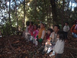 今日も木々にかこまれたすてきな場所で朝の会です。私は初めての場所だったので、KURくんに『行ったことないから教えて。どこどこ?』と言っていたら、KURくんが「こっちだよ。危ないから、はい、お手々」と、優しく手をつないで、案内をしてくれました。(その後も少し崖っぽいところを上るときには、MIWちゃんに手をかしていたね。 とっても、ナイトなKURくんです。)さて、朝の会。倒木の上に一列に並んでいたのは最初だけ。倒木の高いところに跨いですわるYUZ。その向かいに座るZENくん。横面の崖のようなところに並んで座る、AYUくん、RYOくん、KURくん。歩き回っちゃうGAくん。しっかり最後まで座っていたのは、女の子たちなんだなぁ。ホント男の子って、頭より体が先に動くものだと思うのはこんな時。これは男の子の特性といってしまえばそれまでだけど、もうちょっと座っててくれるとうれしいよ。NONちゃんの説明「今日は畑に行ってタマネギを植えるところ、タマネギのお布団作りに行くよ~」子どもたちは、「え~やだ。オレやらな~い。」なんて言う声が、あっちからもこっちからも・・・ 【大人の見えないところまで行って遊ばない。】といういつものお約束をして、さぁ畑に出発だ!着いたらYUZがスコップを使いたがって・・・お手伝い。他の子は「おなかすいた、おべんと食べる。」と早速ひろげ始めちゃった。『まだ、10時です。みなさん・・・』その後、おなかが落ち着いた子から順番にお手伝いにきてくれたり、フユイチゴを食べに行ったり、○○ごっこをしたり、楽しんだね。最後までがんばって耕してくれたのは、ZEくんとSIちゃんだった。その間いなかった男の子5人。少し離れたところで、なにやらみんなでやってるよ。よく見てみると、どうがんばってジャンプしても届かないところに柿が1個だけ。それを取ろうとしてたんだ。木の棒を投げたり、長めの棒でたたいてみたり、最後には5人で持っても持ち上がらないほど長い竹まで持ってきたけど・・・やっぱり取れない。隣の畑で作業していらしたおじさんが声をかけてくれて、取ってくださいました。自分たちでは取れなかったけれど取っていただいたときの子どもたち、それはうれしそうな顔をしていたね。畑から戻ったら、砂のあるところで「○○やさん」が始まった。アイスクリームも焼きそばもケーキもジュースも、すべてひとすくいの砂。砂が食べ物に、木の棒が剣や魔法の杖に、葉っぱがお金やご飯に変わっていく・・・想像力の根っこを育てているのかな。すっごい砂埃にまみれているんだけど、暖かい日向で楽しげに遊んでいる子どもたちを見ていられるのは幸せだ。「こういう時が至福の時です~。」と子どもたちを見ながらうれしそうにNONちゃんが言った。森ひろばから戻ったTOMOちゃん、TAKAちゃんとみんなで、森祭りの練習を少しだけ・・・リズムが取れなくて、転んじゃう子も、上手にできてた子も、みんな笑って何度も楽しんだね。お祭り当日、お休みのYUZと、YUZ母は少しだけお祭り気分を味わいました。(YUZ母)