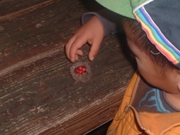 今日も「秋晴れ!」 でも寒~い。特に寒がり親子の私たちはみんなより厚着で登園。ねっこぼっこの子供達は本当に寒さに強いなぁと感心する。いつもよりは1枚上着を着ている子もいるけど、冬用でもないのに私たちはまるで真冬の装い「真冬には何を着るの?」と聞かれてしまった^^; 朝の会の途中Shuくんが綺麗な物を手にしてるのが目に留まった。どんぐりの帽子に真っ赤な木の実を入れて大事そうに持っていた。それはデザ-トみたいに美味しそうな、宝石みたいに綺麗な物で思わずカメラでパシャ! 無断で撮ったので「何で写真撮るんだよ~」と怒られた^^; ごめんね。 今日のお散歩はまずサルスベリへ出発!!ひんやりした森の日陰とは違い、サルスベリの上は日向でとってもポカポカ暖かいのでかな?みんな上で遊んであんまり滑らない。松葉相撲に熱中してMahちゃんはとっても強い松葉を見つけて10連勝くらいしていたね。年長のGaくんは「さすがだなぁ」と感心した。私との対戦の時「引っ張ると負けるんだよ」と小声で言ったのだ。小さい子供達は嬉しさもあり力いっぱい引っ張るけれど、彼は自分から決して引っ張らないのは作戦だったんだねぇ。10時30分頃「お腹すいた~」の声に「俺も」「俺も」と今日は早弁組みが多数。Daくんのみかんの食べ方が面白い。まずはちょっと皮を剥いて、それからかぶりつく!そして食べてしまった皮を口の中から「ぺっ」っと吐き出す。「その辺に ぺっ しちゃだめだよ」と言っても「べ~」と可愛い笑顔で言われた。1学期のDa くんからは想像の出来ない行動に、すっごい成長を感じて嬉しかった。^^ そんな中Yutくんが唇を切って出血。しばらく泣いて落ち込んだけど、今日はママがお当番で傍に居てくれたおかげで気を取り直して遊び始めたのでひと安心。 Mahちゃんから「緑のトンネルに行きたい」と提案があり、みんなで再度お散歩へ出発!私は初めて行く場所だったので、ワクワクしていた。到着するとココもまた日向で暖かい空間だったのでみんなでお弁当をいただき、色んな遊びを始めた。順番に木登りするAyuくん・Ryoくん・Ze。細い木の根っこが地面に出ているのを見つけて「お芋掘り~」先日のさつま芋掘りを思い出したんだね。鬼ごっこする大きい子チ-ム。Siちゃん・Miwちゃんペアは土の中から冬眠寸前?のミミズを見つけたよね。 今日は週末だったけれど、いっぱい遊んで元気な子供達に感心した。そして、お散歩の途中でゴミを見つけると拾ってくれる子供達を誇りに思った。 今日は岐阜県から「自然が人間の体にどんな良い影響を与えるか?」を勉強されている先生と学生さんが見学に来られた。お2人とも朝から子供達に大人気で、いっぱい一緒に遊んで下さりありがとうございました。また遊びに来てください! ZE母より
