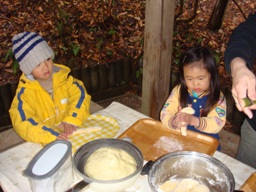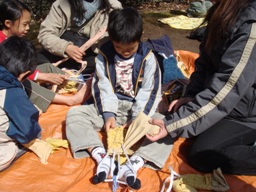 昨日の野外料理で、NONはとっても反省をしました。前日に降った雨のため、落ち葉が濡れてなかなか火がつかないので、今日は2つの炉だけで火を熾しましょう。とみんなで言っていました。気がつくと、一つの炉にYU君が。そしてもう一つの炉にAYU君と、RYOが。すると、その炉の近くで、ZE君が「僕も炉で火をおこしたい!!」と言っていました。この日は、ZE君のお母さんが保育当番に入ってくださっていたので、ZE君は一生懸命お母さんに「一つの炉で火をおこしたい!!」と訴えています。でも、今日は2つの炉しか使わない。火を熾すためにはZE君は、仲間に入れてもらうしかない。でも、順番は嫌だという。お母さんに訴えても、変わらないので、ZE君は、NONに訴えてきました。私は、きっとZE君は火を熾すことがだんだんわかってきたから自分で熾したいんだなぁと思い、軽く、「いいよ~~。」と言ってしまいました。すると、ZE君のお母さんが「今日は2つの炉だからいいんです。」とおっしゃいました。代わってとも言えないし、順番も嫌だ。それで、ZE君は大泣き。でも、大泣きしながらも、RYOとAYU君が炉を離れたすきに、その炉の前の場所を頑張って取ることができました。場所を取られたRYOは、YU君と一緒に火を熾しています。AYU君は、少し気に入らないみたい。でも、なかなかつかないZE君の火を、そばで見て、手を出して、口を出して、ようやく2人で火を熾すことができました。今日は落ち葉が湿っていたために、本当に苦労したけれど、(新聞を途中使ったりしたけれど)やっと熾せた火。ZE君も、AYU君も本当にうれしそう!!そして、NONを見て、ZE君は、一言、「AYU君がつけた火だよ!!」と。そして、「仲間だから!!」と、ZE君が持って来た捕食を半分こしていました。この瞬間、NONは、さっき言った自分の軽はずみな一言にとても反省しました。もし、あのままZE君の言うままに、一つの炉を増やして別々の火を熾していたらそれはそれで、納得できたかもしれないけれど、ZE君の悔しい気持ちや、AYU君が手伝ってくれた時のうれしさは今と同じではなかったと思う。大事なことを教えてくださったZE君のお母さん、本当にありがとうございました。そんな大事な火で作ったカレーはとても美味しく、みんな次々にお代りをしていました。まだまだ反省の多い毎日だったりするけれど、大事なことは、子どもたちを通してしっかり学んでいけれる今の環境にとっても感謝しています。(NON)