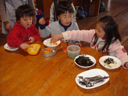 今日は3日に節分ということで、豆まきをしました。TOMOちゃんが、節分の説明をしてくれます。節分は年に4回もあるんだって!知らなかったわ~~。朝からソワソワしていたけれど、その説明の中、少しの物音でも、ビクッッとしていた年長児GA君。その予感的中!!モモ太郎のお話が終わると、鬼が飛び出してきました。みんな、MAHちゃんの作ってくれた豆を入れる「マス」を持って鬼退治です。「鬼は外!!」と、叫びながら豆を投げていくのですが、先ほどビクッとしていた、GA君は、鬼が近づいてくると、対抗するものの怖くて泣いてしまいました。他にも、泣く子もいたけれど、強い子もいるいる!鬼を追いかけて森のほうまで、走ってきたKU君やRYO。 豆まきが終わると、みんなで太巻き作りです。お母さん方が作ってくださった料理を巻いて出来上がり!!今年の恵方は南南東ということで、みんなで同じ方角に向かって黙ってもぐもぐ・・・。すごいなぁ。こんなに長い時間黙っているみんなを見たのははじめてかも。その沈黙に思わず吹き出してしまう子もいたりしたけれど、何とかみんな食べることができました。年の数だけのお豆を食べたり、TAさんからいただいたいよかんのおやつや、今日まで遊びに来てくれたYAちゃんの差し入れのおやつを食べてお腹いっぱいになりました。帰りの会が終わってからまいた豆を拾い集める子もいたのですが、これでおうちに鬼が来ても、大丈夫・・かな??