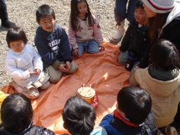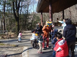 今日の場所は、昨年プレようちえんで来たことのある場所だった。 小さな橋を渡り、川のほとりを歩く。再び小さな橋を渡り、山へと続く小道を入る。川のほとりの道中には金柑の木があります。その下に落ちた金柑を拾うのが子供達のお楽しみです。今日はなかなかの豊作だったよう。そして、お弁当を食べて落ち着く場所は、陽だまりのある畑の一角。 畑の奥には、小さな池があることをはじめて知った。池の表面にはうっすらと氷が張っていて、当然それを見てじっとしていられないのが子供達。早速、小さな石ころやどんぐりを投げてみては軽快に転がっていく様を存分に楽しみだした。 その時です…「あれっ?何か聞こえた?」池のほとりで遊 んでいた子ども達の動きが止まった。「コンコンコンコンコン~…」キツツキだ!「コンコンコンコンコン~」また聞こえる!近くの木にいるにちがいない!みんなで近くの木をくいいるように見上げる。あっ飛んでいった! 残念ながら木を突いているところは見えなかったけど、飛び去る姿は意外にも小さかった。頭が赤かったのでおそらくアカゲラであろうと分かった。(TOMOちゃん所持の野鳥図鑑による)ラッキーな出会いにとても嬉しくなった。さらに偶然、木のてっぺんにリスさんのお家も発見できた。 帰り道は、落ち葉のたっぷり積もった山の斜面を登った。大人も気合のいる斜面だったが、スピードに個人差はあれどみんな立派に登りきった。 そして帰りは暖くんの4才のお誕生会。ママの手作りスイーツをいただきます。お誕生会って、ママもそしてまた本人も始終みんなからくすぐられている気持ちがするんですよね。おめでとう おおきくなるんだよ~森からもきっとたくさんのプレゼントがあったでしょう。それを開くのはもっと大きくなってからかしら?(MI母)